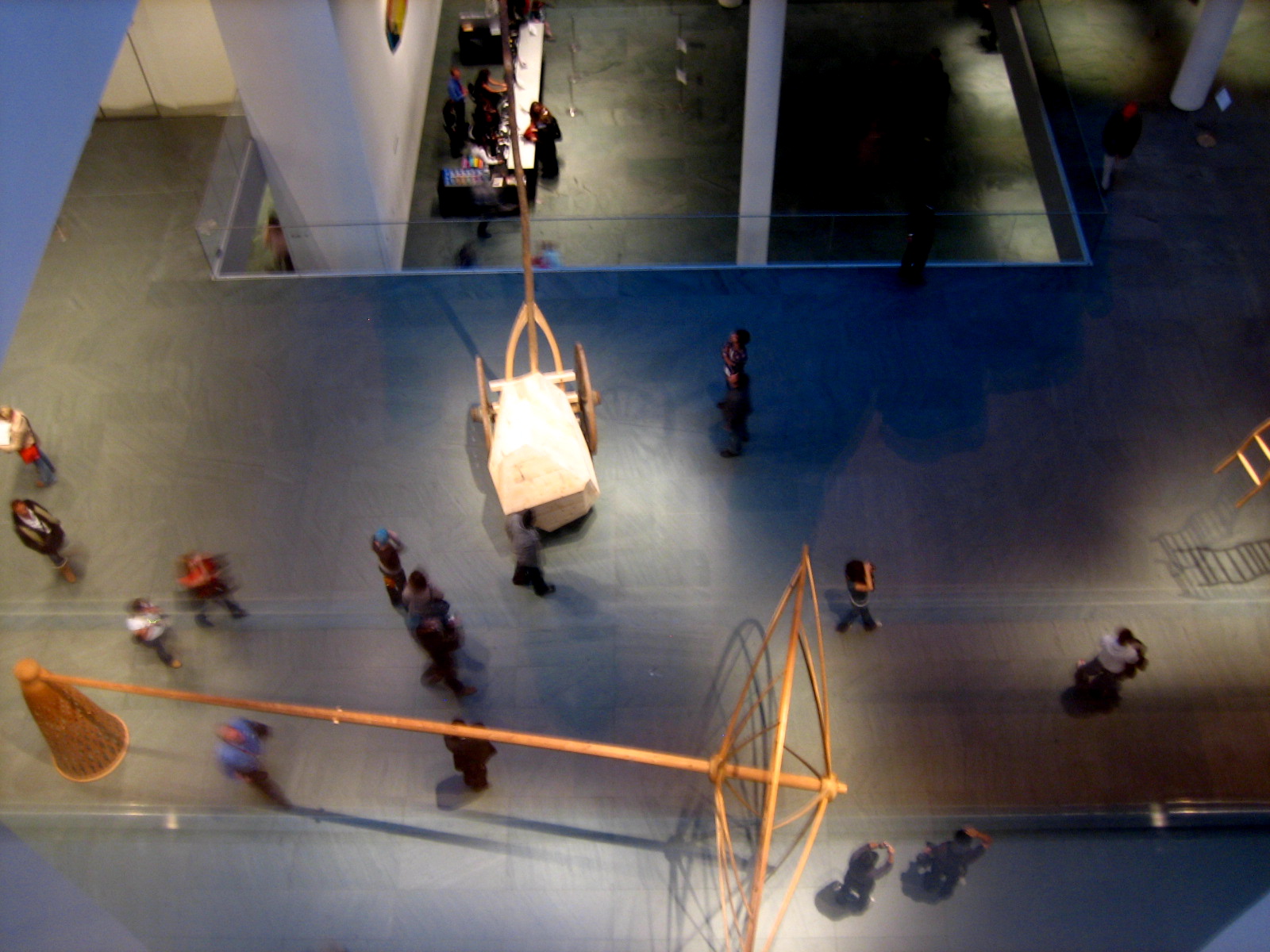 Part of the museum’s special sixth floor exhibit, Puryear’s retrospective at MoMA is not arranged chronologically but thematically, according to the artistic processes involved in creating each piece. The changes MoMA has made with lighting highlights the grandly scaled sculptures, particularly in the evening. Regardless, the minimalism of the space and sculptures somehow complement each other and is a brilliant usage of the atrium. Although photography is not permitted on the sixth floor (as usual), AO has photos of the atrium pieces taken from several floors above the vanishing points of the sculptures.