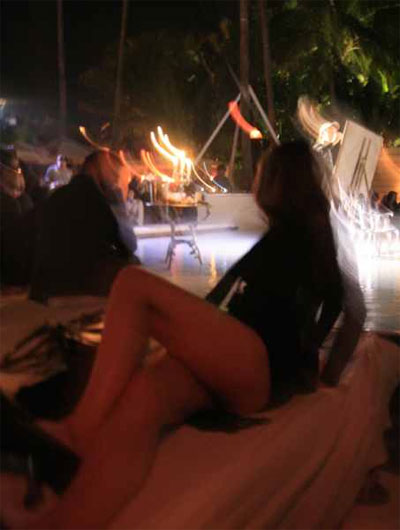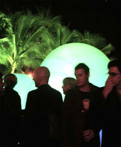 Next, the party of the night was the Whitney Museum party at the Sagamore Hotel. The Sagamore is the place for the young, hip of the art world; For Basel, it recently debuted on its stark white walls the famed, salacious nude photos of Spencer Tunick. However, by the action remained outside, where hundreds of art aficionados traipsed down the well-manicured garden path, past plush coaches with art films flickering black and white photos, to the blue-lit pool, where large, blow-up beach balls floated delicately in the glistening water.