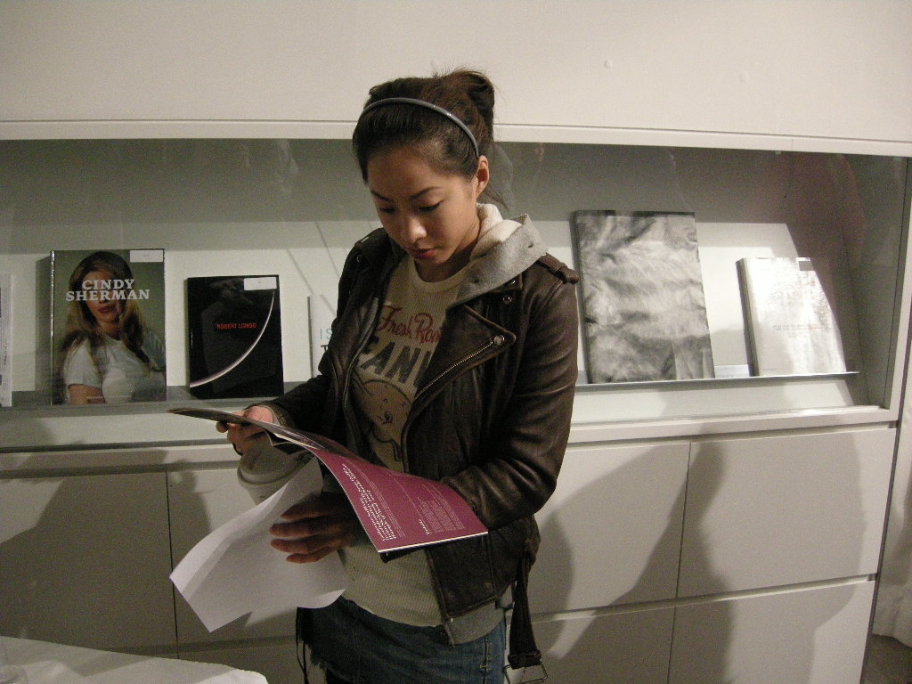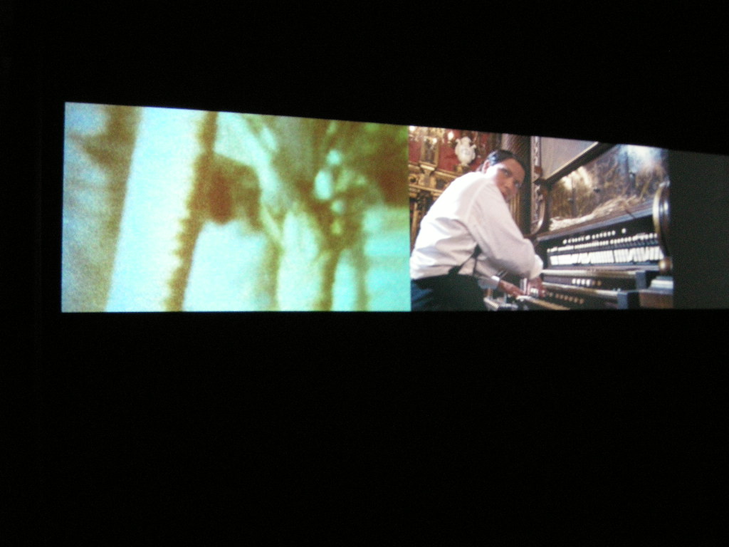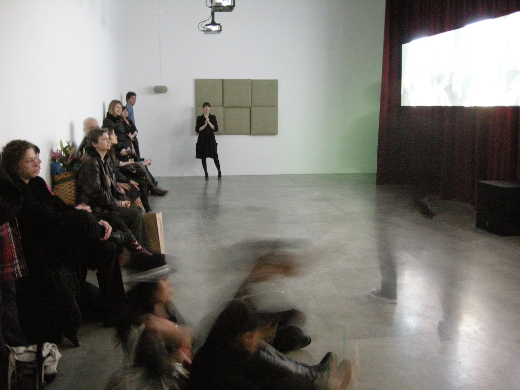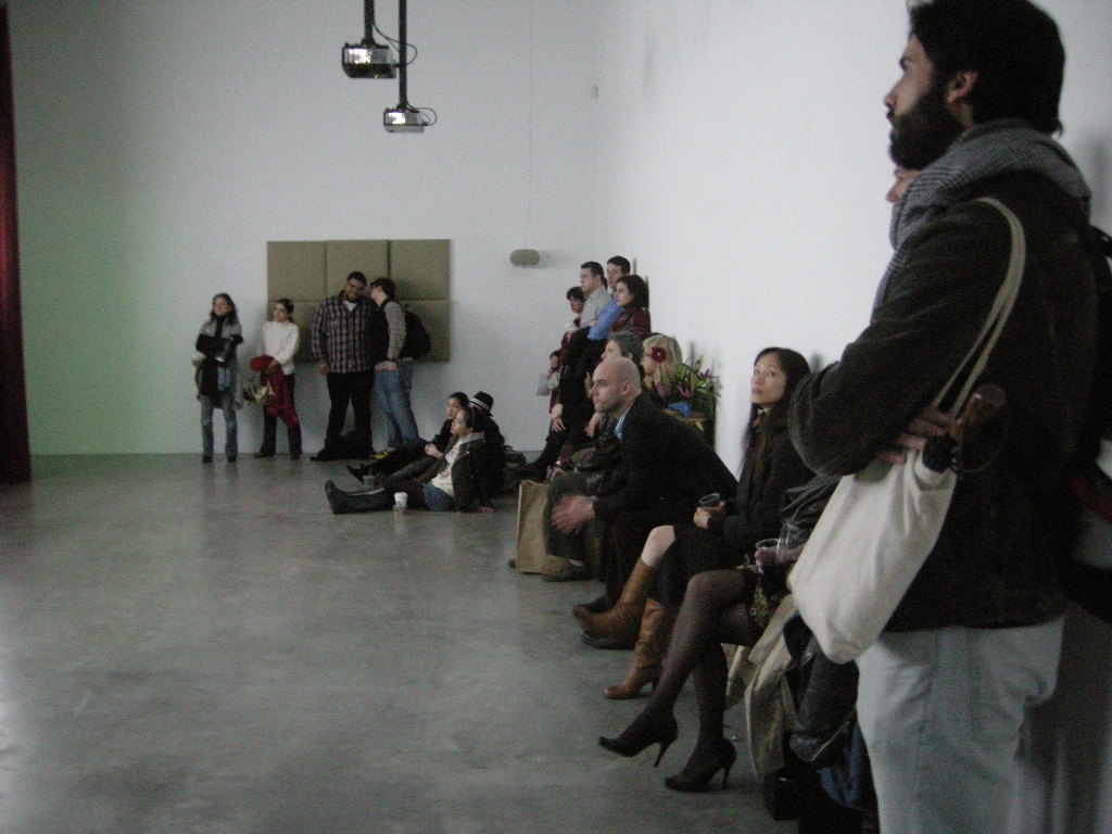 Opening goers stared at the large screens, some with brows furrowed trying to pull some thread of linear time and causal relationships from the piece, while others giggled at the grunts, wheedles and flailing arms.