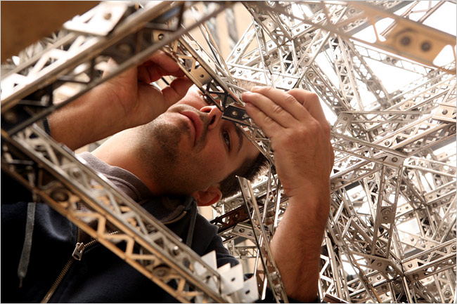 “I have always wanted to build a model skyscraper using Erector parts. The model skyscraper, built from a toy and 65 feet in height, takes on the dimensions of a full sized building. The circle of actual buildings inspiring a toy in 1909, which is then used to build a model skyscraper the size of an actual building in 2008, is a beautiful metamorphosis.” Says Chris Burden. (via Public Art Fund)
