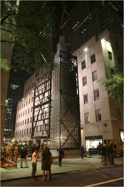 Chris Burden has installed a piece called What My Dad Gave Me at the Rockefeller Center’s Channel Gardens. In brief, it is a 65-foot skyscraper made completely out of small, stainless steel Erector Set pieces. This six-story exhibition is presented by the Public Art Fund and Tishman Speyer.
