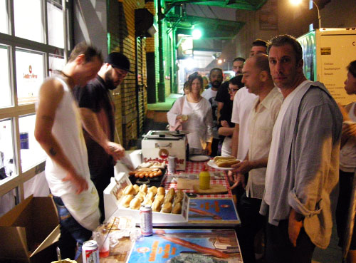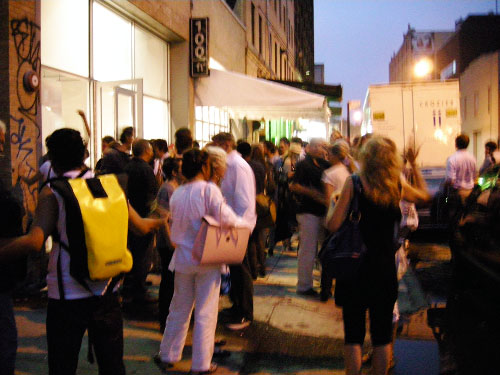 Serving up Hot Dogs out front of 303 Gallery’s new location via Art Observed