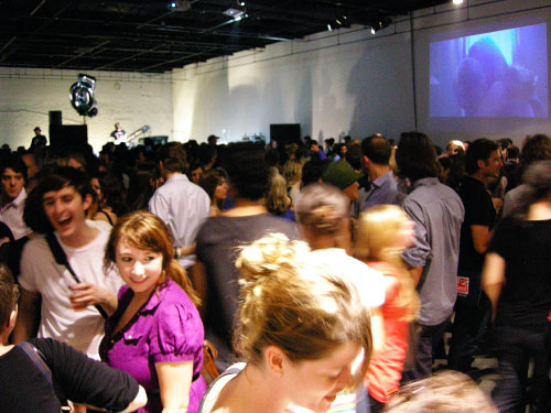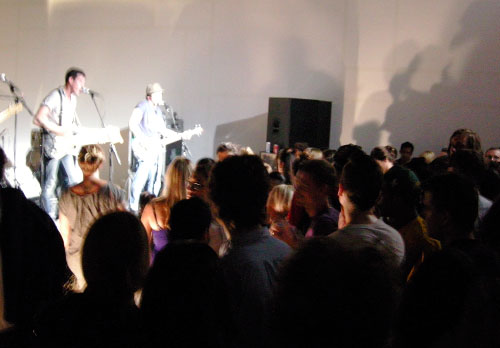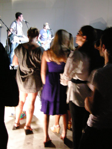 Guests enjoying the performance by The Virgins at 303 Gallery via Art Observed
