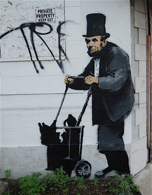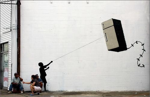 Banksy has chosen New Orleans for the location of his most recent work. Throughout the city, Banksy has created more than 12 murals that depict Abraham Lincoln as a homeless man, a marching band wearing gas masks, and a boy flying a refrigerator kite. The New York Times reports that in a statement released by Banksy, the murals were created in response to Fred Radtke, an antigraffiti campaigner also known as the Gray Ghost, who uses gray paint to cover up graffiti. The statement released by Banksy also said, “Three years after Katrina I wanted to make a statement about the state of the clean up operation.”