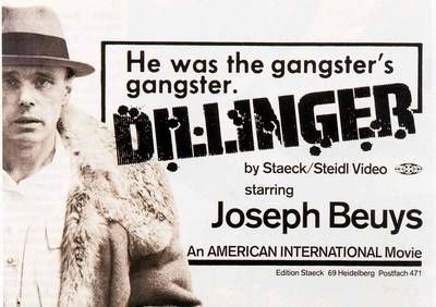 The Moment explains, “Tributing John Milius’s 1973 film ‘Dillinger’ with a quick-and-dirty conceptual remake, Beuys’s poster allows the artist’s obligatory mythmaking to displace the actor Warren Oates and crib the film’s original tag line: ‘He was the gangster’s gangster.’ Even when flattened and hung on a wall, Beuys’s charismatic agenda continues to outfox, seduce and refocus the art of his storytelling.”