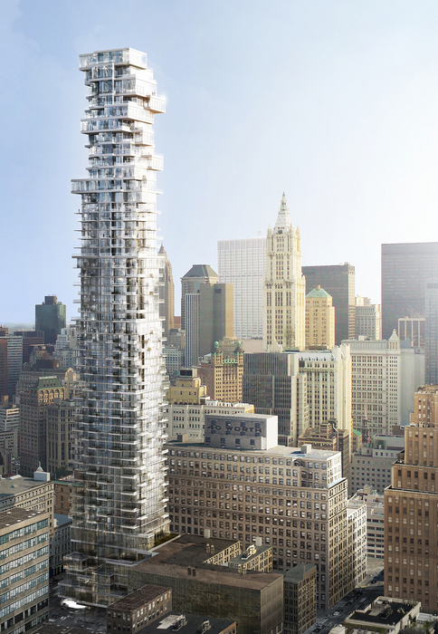 Herzog & de Meuron’s 56 Leonard St., shown rising above Lower Manhattan in a rendering, employs the calculated irregularities and asymmetries of the Deconstructivist style. via Andrea Schwan Inc. The condominiums that will be offered for purchase range from $3.5 million to $33million and have been described as “houses stacked in the sky.”