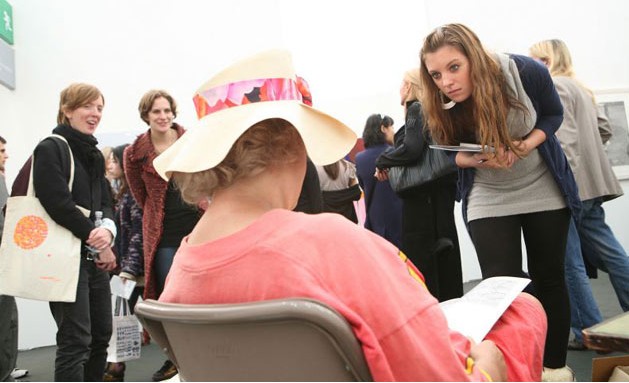 The usual spectacles were evident. Appetite Gallery of Buenos Aires seemed to be camping out in the center of the floor in a booth strewn with sundries, coffee cups and loosely displayed art. The Icelandic artists collective Kling & Bang built a to-scale reproduction of the famous Reykjavik bar Sirkus, complete with shots served. Tue Greenfort’s “Condensation” consisted of a room and mechanism which collected moisture (mostly sweat and exhalations) from the air at the fair and bottled it. There were fully encapsulated, transparent, smoking booths. Miami-based artist Bert Rodriguez offered foot massages. The gallerist Anthony Reynolds used much of his booth for a pile of candy in shiny blue wrapping in an homage to Félix González-Torres. A group of wandering gigolos, Los Romeos, moved through the room striking up conversations with visitors in project by Dora Garcia, a Spanish artist, based on the activities of East German spies who seduced West German secretaries during the Cold War. Emmanuel Perrotin installed Duane Hanson’s lifelike sculpture, Flea Market Lady, (pictured above), which is a $575,000 hyper-realistic work of a woman surrounded by cheap art, books and relatively high-end auction catalogs.