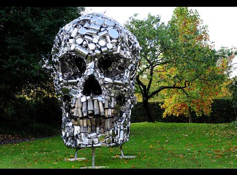 The 8-foot-high stainless steel sculpture by Subodh Gupta, known as the “Damien Hirst of India” entitled ”Mind Shut Down” in the adjacent sculpture park. It sold for just over 1 million euros the Frieze Fair. Image via Bloomberg