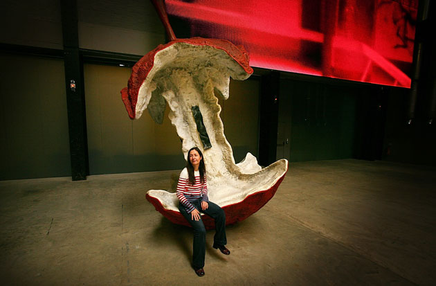 Gonzalez-Foerster taking a seat in her over-sized version of Claes Oldenburg’s apple core via The Indepedent. The artist whose work has rarely been seen in the UK created TH.2058 as her first British commission. Though the artist was included in the Tate’s World as a Stage exhibition last year where she showcased a 1998 work entitled Séance de Shadow. The work which allowed visitors to cast human shadows on the walls and become actors in real-time demonstrated Gonzalez-Foester’s committment to include the viewer in her creation. TH.2058 does so similarily with its invitation to lay down on a bed, pick up a book, and listen to the sound of the rain.