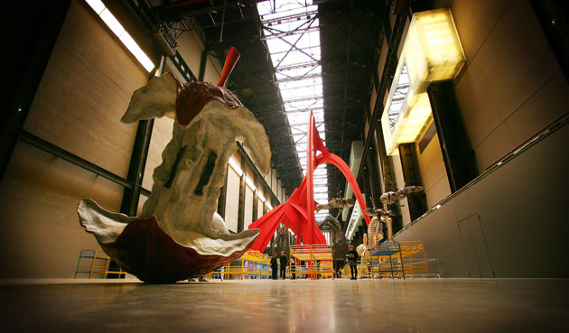 The Tate Modern, London is currently displaying its ninth Turbine Hall installation by French artist Dominique Gonzalez-Foerster. The installation is inspired by the artist’s vision of an apocalyptic London 50 years into the future. The work aptly named TH.2058 imagines the city under siege by flooding, bombing, and invasion, its residents forced to take shelter in the Tate’s Turbine Hall in order to escape the never-ending rain. Gonzalez-Foerester has filled the hall with rows of of bunk beds scattered with science-fiction novels such as George Orwell’s 1984 and Jack Finney’s Invasion of the Body Snatchers. A literal homage to the writings that helped inspire the work. The beds are pinned beneath giant replicas of sculptures previously housed in the Tate, including a gigantic duplicate of a spider by Louise Bourgeois and a colossal copy of Alexander Calder’s pink flamingo. A screen hangs over the end of the space and displays what Gonzalez-Foerester calls The Last Film; a montage of science fiction clips from Planet of the Apes, The Man Who Fell to Earth, and Solaris among others. All of this coupled with the constant sound of rain. The piece was inspired not only by science-fiction works but also by the 2005 London subway bombings that killed 52 and the 1940-41 bombings of Britain by the Nazi’s.