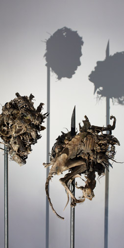 Noble and Webster’s Dark Stuff recalls the ancient Egyptian belief that deities could take the form of animals such as cats, dogs and birds as well as the practice of breeding these animals to later be mummified and offered back to the gods. Noble and Webster have assembled the mummified remains of various animals caught by their pet cats over the past few years, arranging these remains to create projected silhouettes of the two artists’ own faces.
