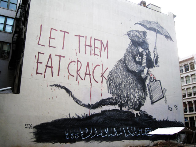 The large-scale Banksy piece on the corner of Howard St. and Broadway in Soho is the second entire-building-facade work found in downtown Manhattan this week (the first covered by ArtObserved here) and is also the second collaboration between Banksy and the professional advertisement firm, Colossal Media. The massive rat, filled with fast scrawling black-lines to appear as if done in crayon or marker, stands next to dripping red letters reading, “LET THEM EAT CRACK.”