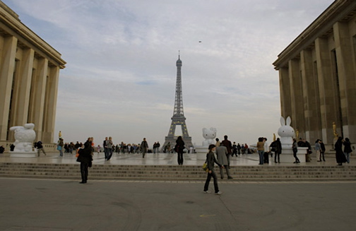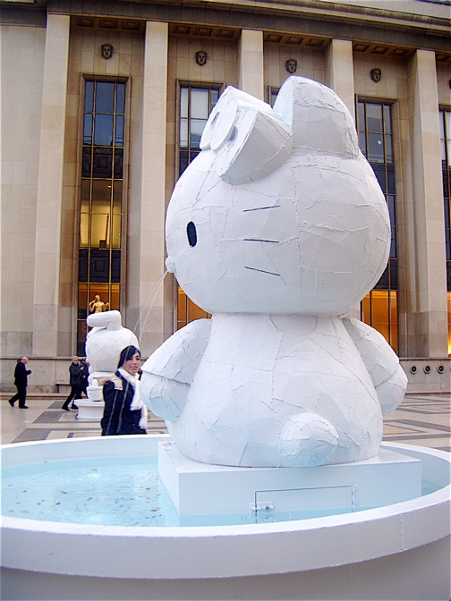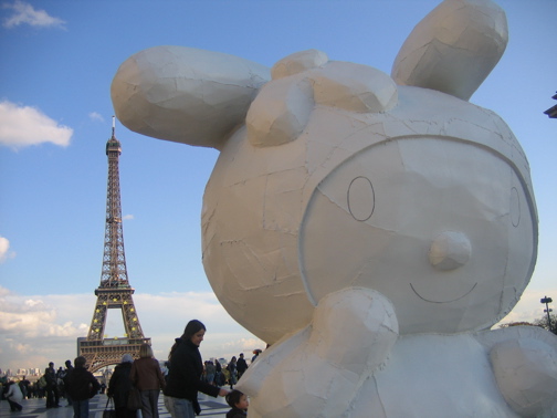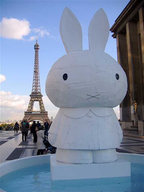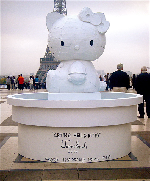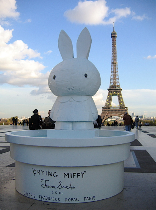 After a show at Lever House in New York earlier this year (previously covered by ArtObserved here), Tom Sachs’ crying sculptures based on Sanrio characters went on display in Paris. The three sculptures were available for public viewing through November 2nd at the Place du Trocadero, in the shadow of the Eiffel Tower, and were an off-site installation of Sachs’ show at the Galerie Thaddaeus Ropac. Entitled “Miffy,” “Hello Kitty,” and “My Melody,” the sculptures appear to be made of foamcore, known to be Tom Sachs’ favorite material. They are actually made of bronze, and constructed to mimic foamcore and the cut and paste aesthetic found in many of the artist’s works. The show will run until November 22nd, 2008, at the Galerie Thaddaeus Ropac.