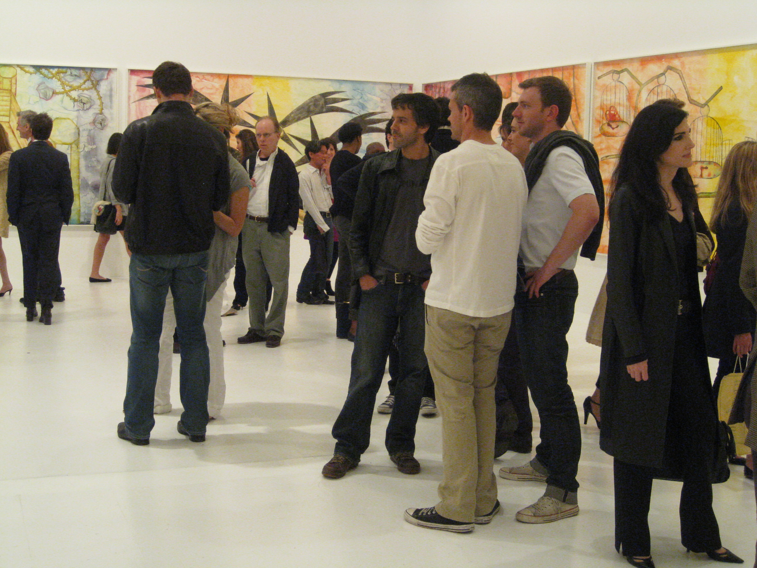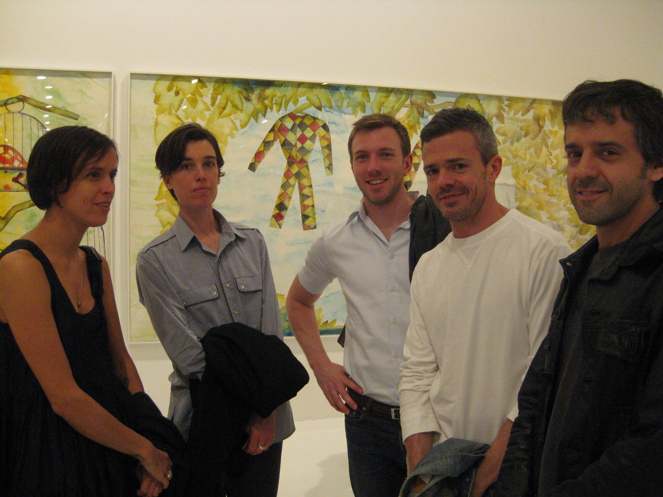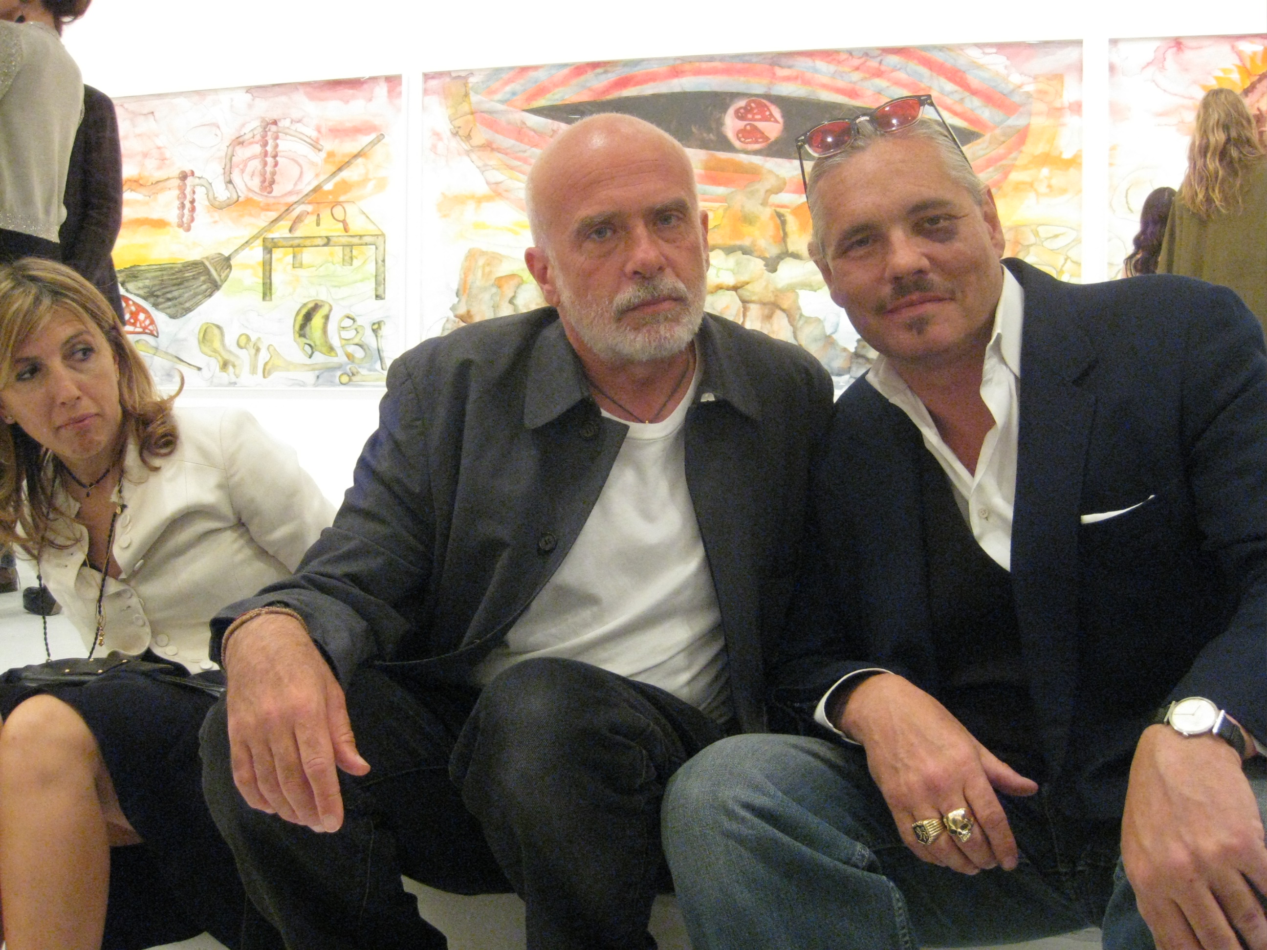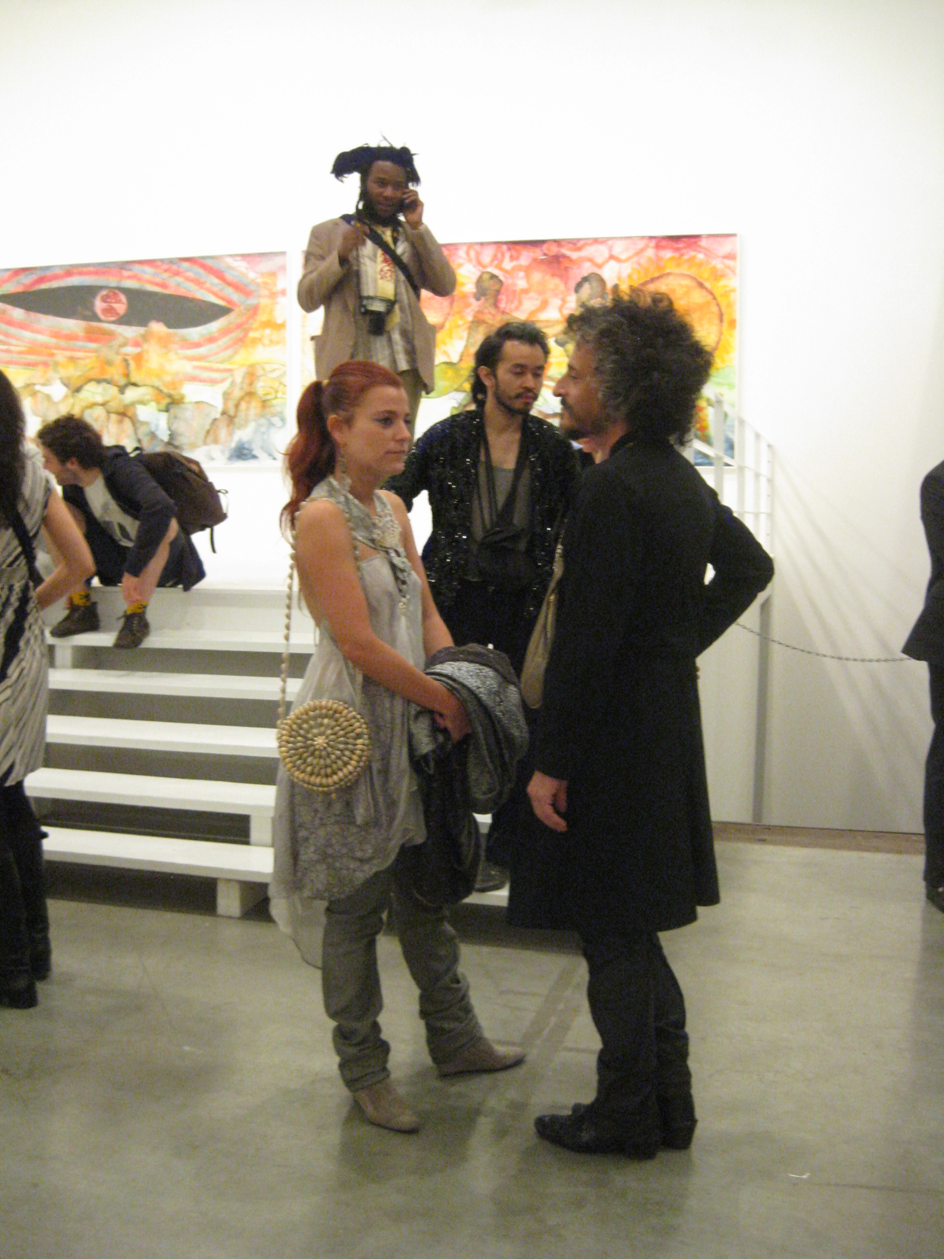 Last night, Francesco Clemente’s latest show at Deitch Projects opened with a star-studded evening in SoHo. The exhibition consists of large-scale watercolor paintings that are positioned in a continuous line along the gallery walls. This particular hanging corresponds to Clemente’s aim to embed art with a spiritual experience. The idea of a rainbow closely reflects the works in the show. For Clemente, a rainbow is a symbolic structure that sets up connections between people and worlds, and using watercolor allows the light of the paper to come through. Moreover, the watercolors are bright and come after a long period in which the artist worked with a darker palette. In order to arrive at the final form of the works, Clemente started out with three large scale canvases that were each 60 foot (about 18 meters) long. He then divided each of them by cutting them into five separate sections. When hung next to each other, the rainbows reconnect in the mind of the viewer. The iconography in the work is derived from candomblé from the Americas, alchemy from Europe and tantra from India. The exhibition will run through May 30, 2009. Among the crowd were Goldie Hawn and daughter Kate Hudson who were enjoying the show with artist Dustin Yellin who was is now showing at Robert Miller Gallery and who was interviewed by AO recently here.