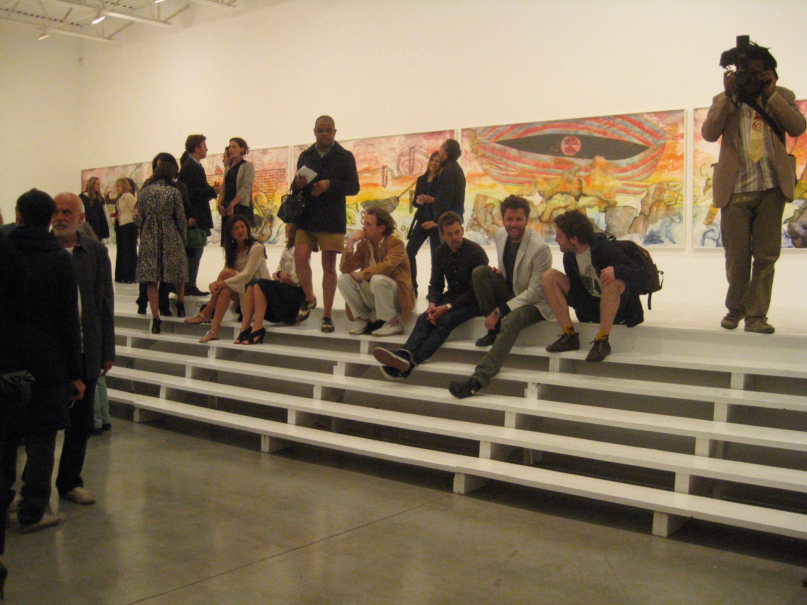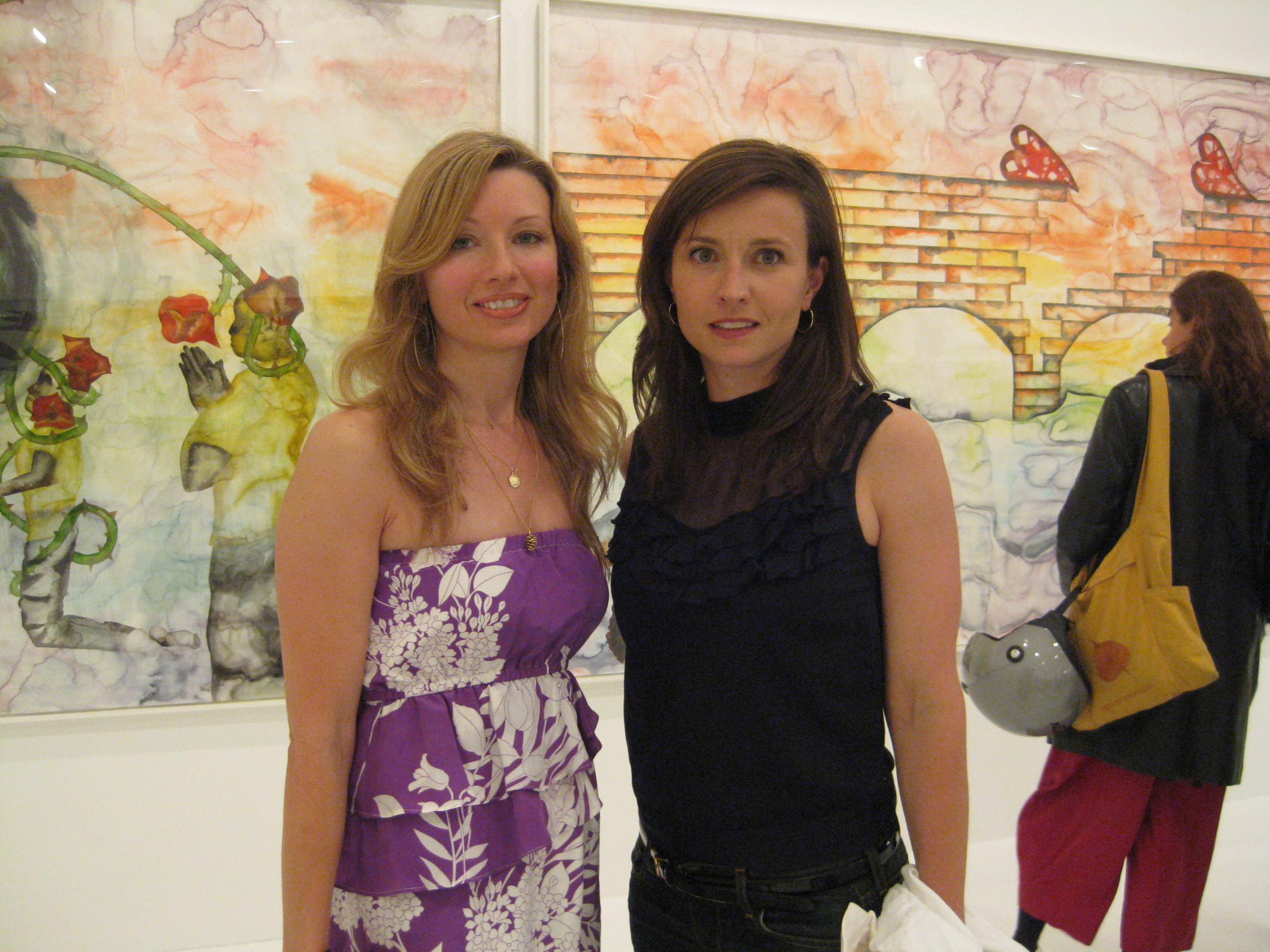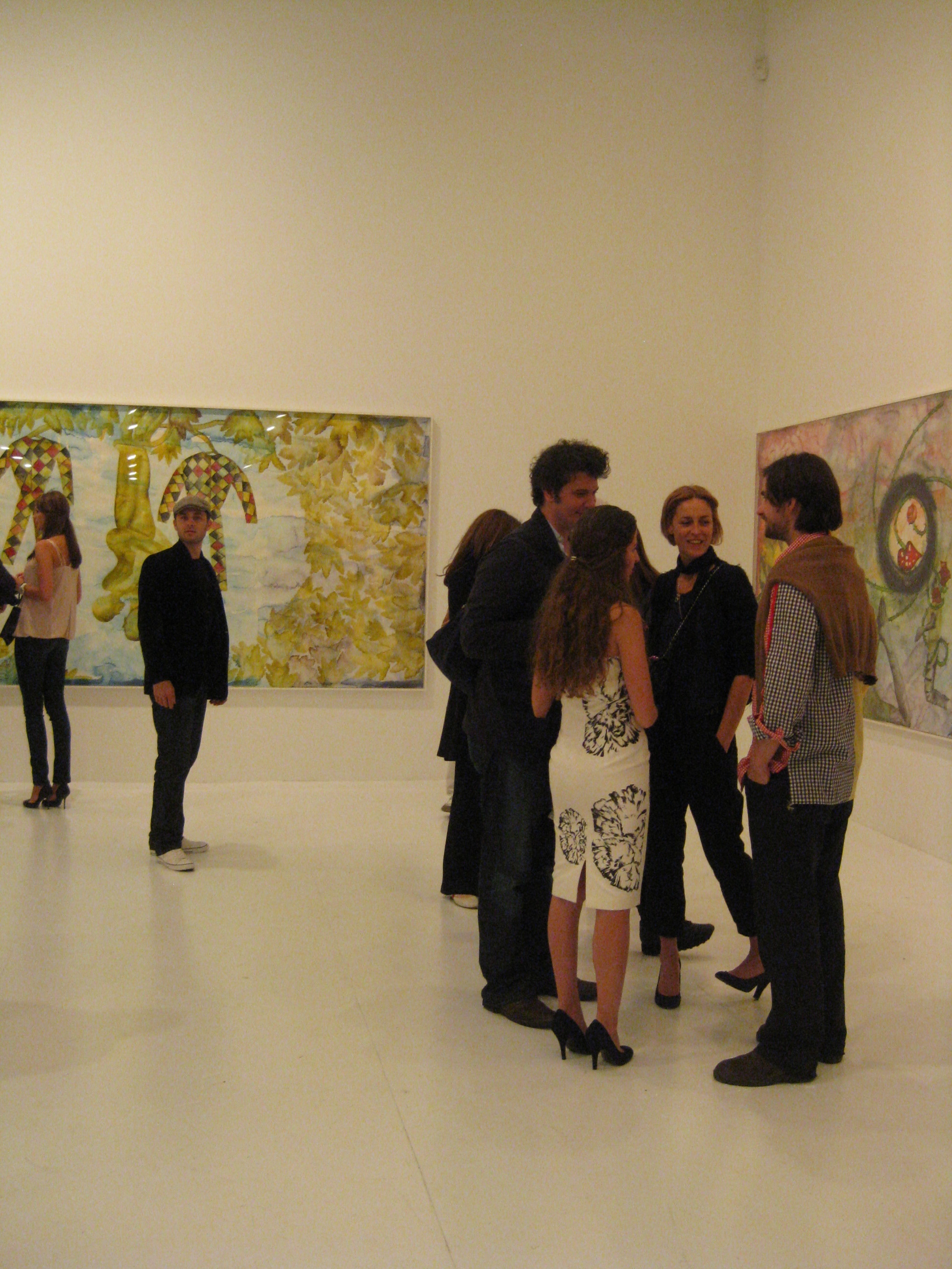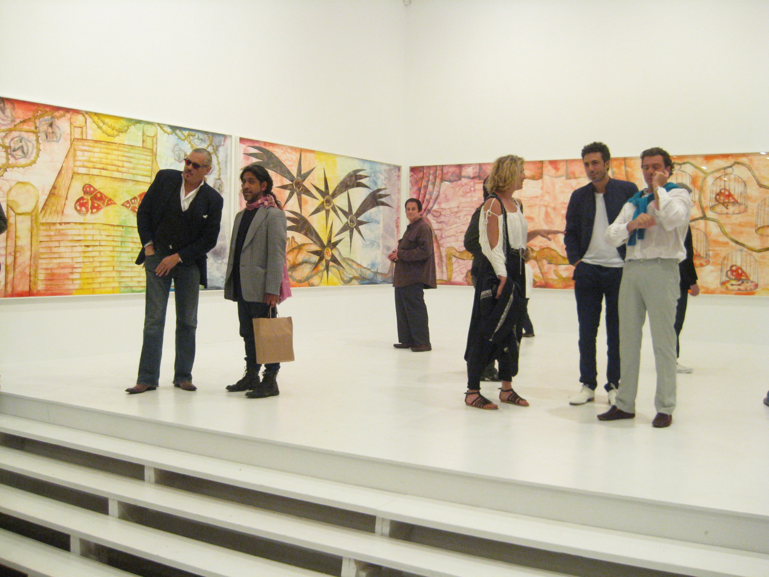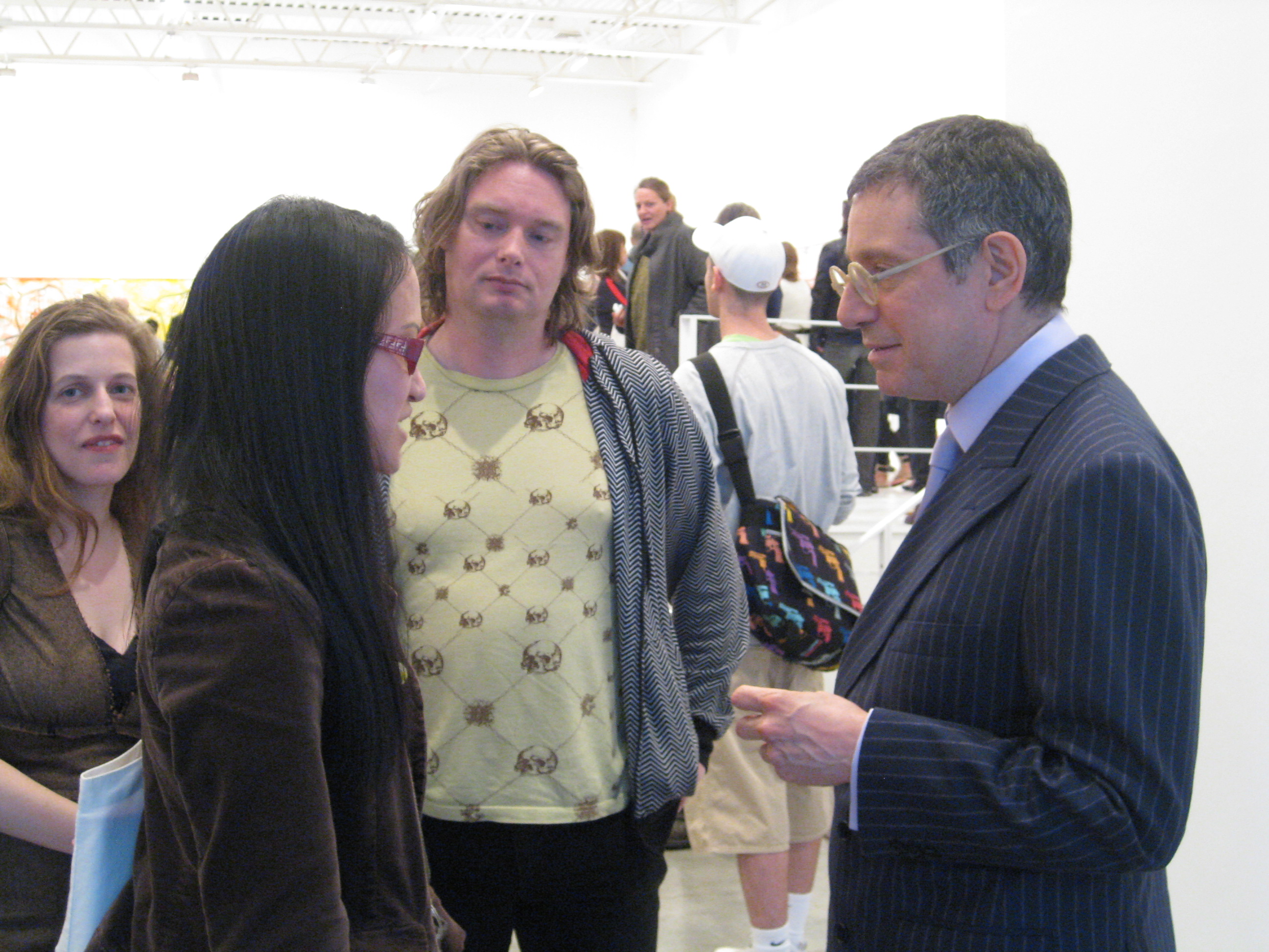 Last night, Francesco Clemente’s latest show at Deitch Projects opened with a star-studded evening in SoHo. The exhibition consists of large-scale watercolor paintings that are positioned in a continuous line along the gallery walls. This particular hanging corresponds to Clemente’s aim to embed art with a spiritual experience. The idea of a rainbow closely reflects the works in the show. For Clemente, a rainbow is a symbolic structure that sets up connections between people and worlds, and using watercolor allows the light of the paper to come through. Moreover, the watercolors are bright and come after a long period in which the artist worked with a darker palette. In order to arrive at the final form of the works, Clemente started out with three large scale canvases that were each 60 foot (about 18 meters) long. He then divided each of them by cutting them into five separate sections. When hung next to each other, the rainbows reconnect in the mind of the viewer. The iconography in the work is derived from candomblé from the Americas, alchemy from Europe and tantra from India. The exhibition will run through May 30, 2009. Among the crowd were Goldie Hawn and daughter Kate Hudson who were enjoying the show with artist Dustin Yellin who was is now showing at Robert Miller Gallery and who was interviewed by AO recently here.