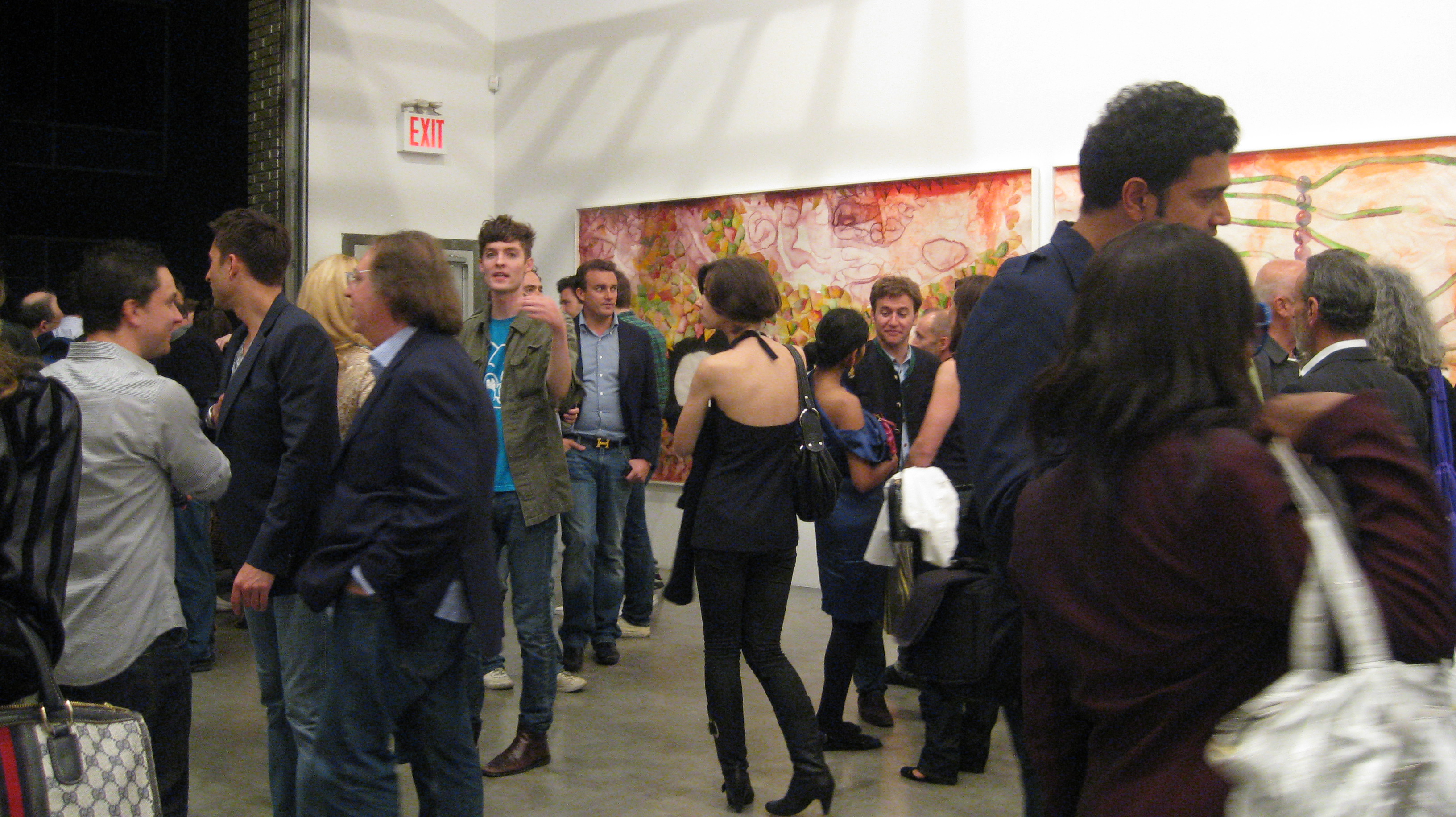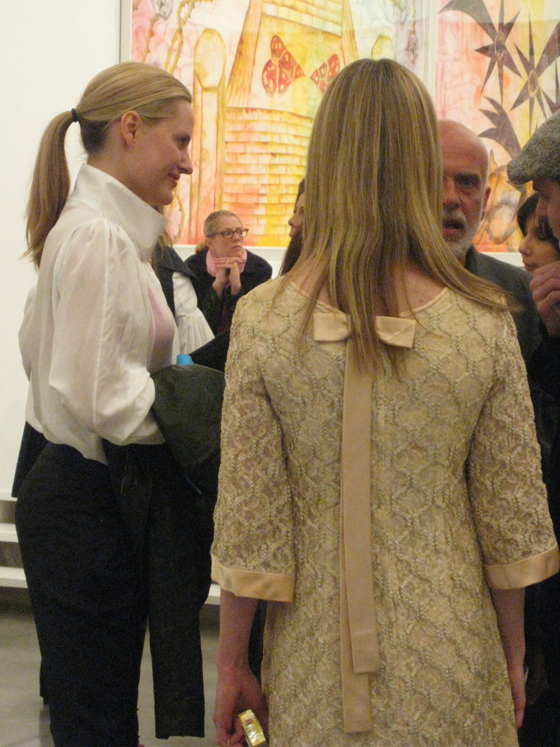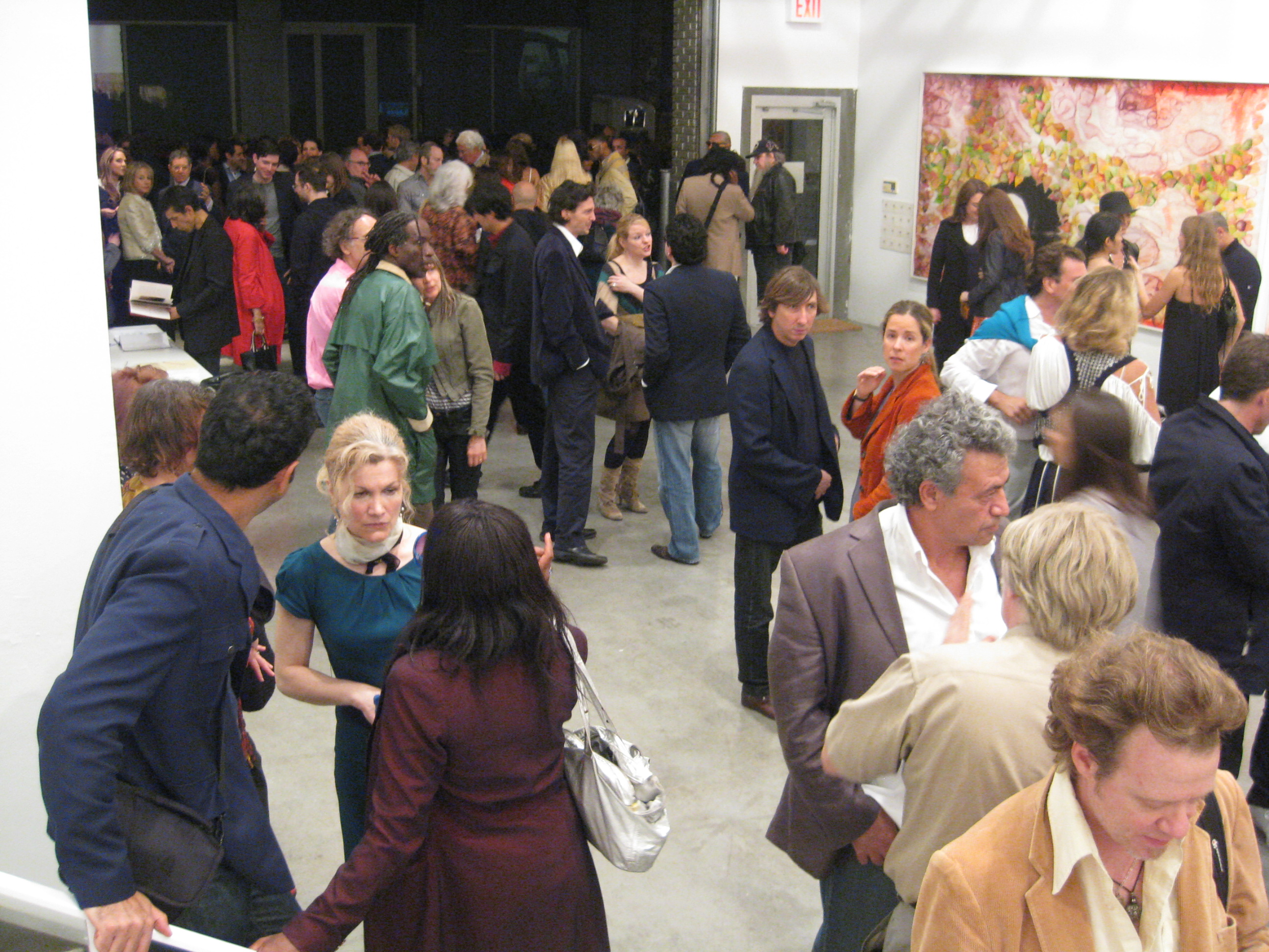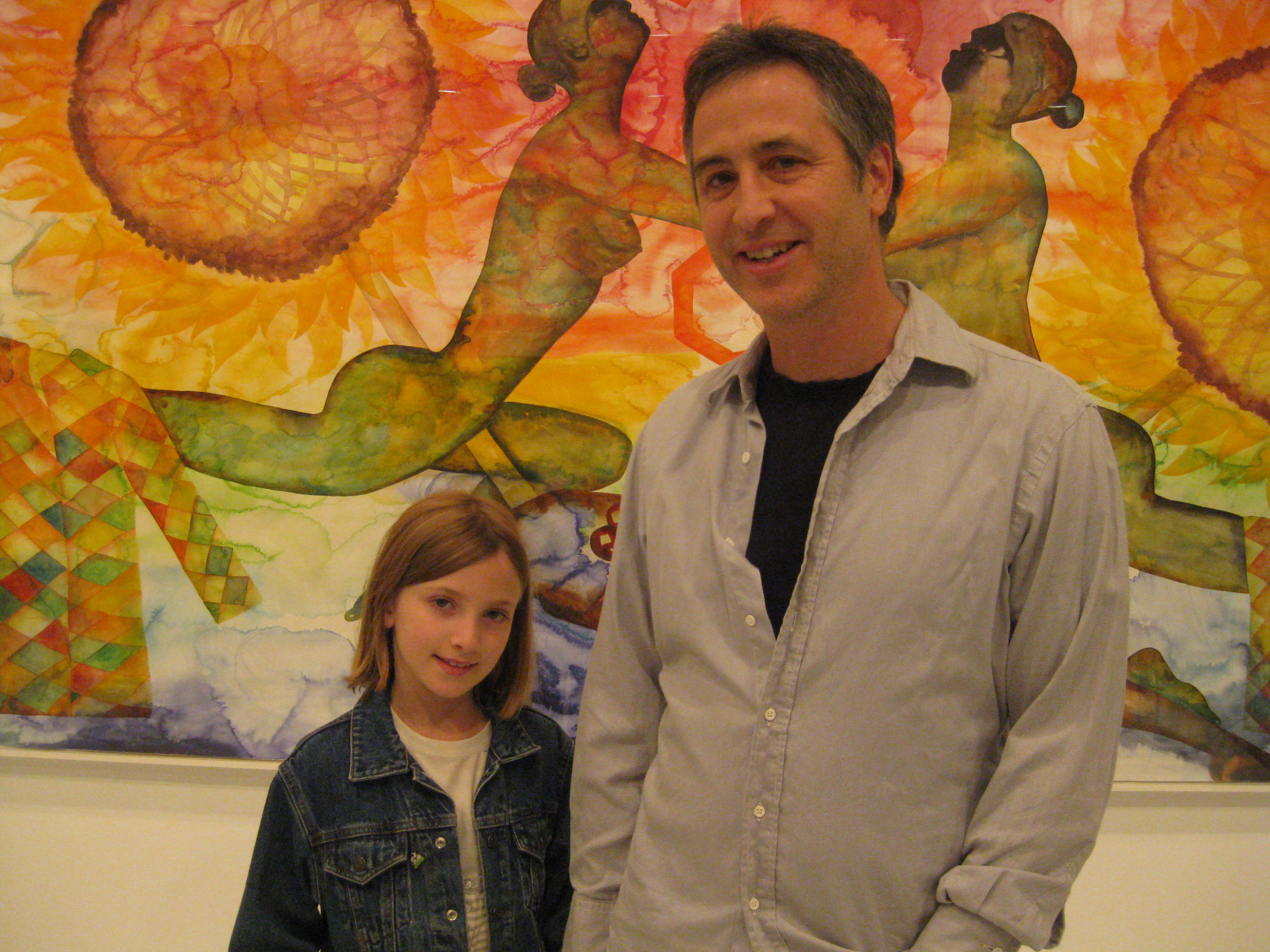 Last night, Francesco Clemente’s latest show at Deitch Projects opened with a star-studded evening in SoHo. The exhibition consists of large-scale watercolor paintings that are positioned in a continuous line along the gallery walls. This particular hanging corresponds to Clemente’s aim to embed art with a spiritual experience. The idea of a rainbow closely reflects the works in the show. For Clemente, a rainbow is a symbolic structure that sets up connections between people and worlds, and using watercolor allows the light of the paper to come through. Moreover, the watercolors are bright and come after a long period in which the artist worked with a darker palette. In order to arrive at the final form of the works, Clemente started out with three large scale canvases that were each 60 foot (about 18 meters) long. He then divided each of them by cutting them into five separate sections. When hung next to each other, the rainbows reconnect in the mind of the viewer. The iconography in the work is derived from candomblé from the Americas, alchemy from Europe and tantra from India. The exhibition will run through May 30, 2009. Among the crowd were Goldie Hawn and daughter Kate Hudson who were enjoying the show with artist Dustin Yellin who was is now showing at Robert Miller Gallery and who was interviewed by AO recently here.