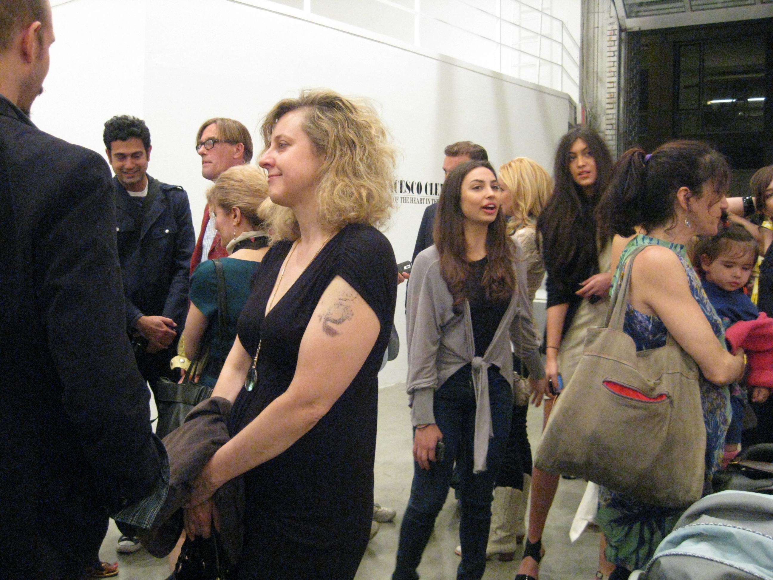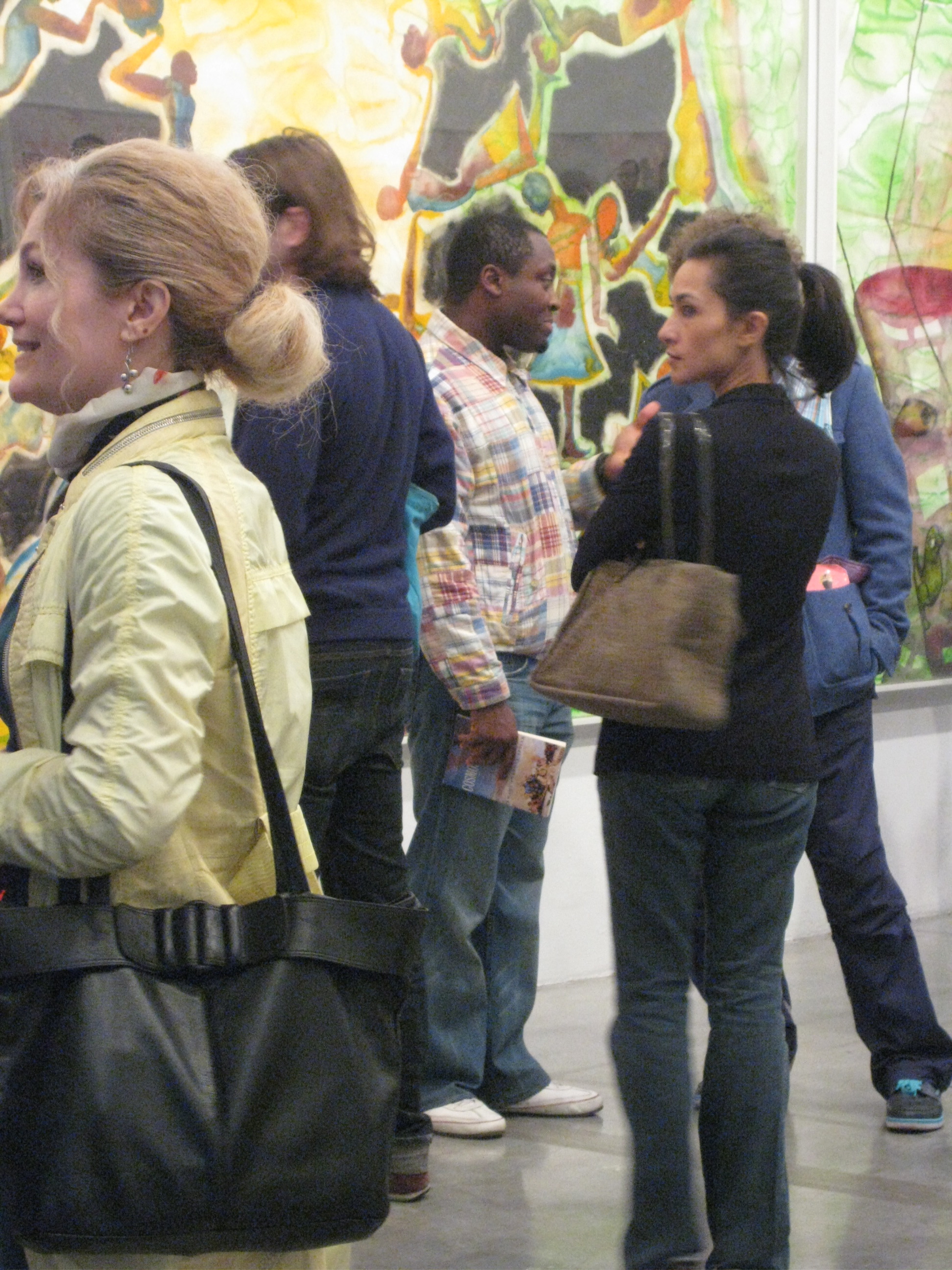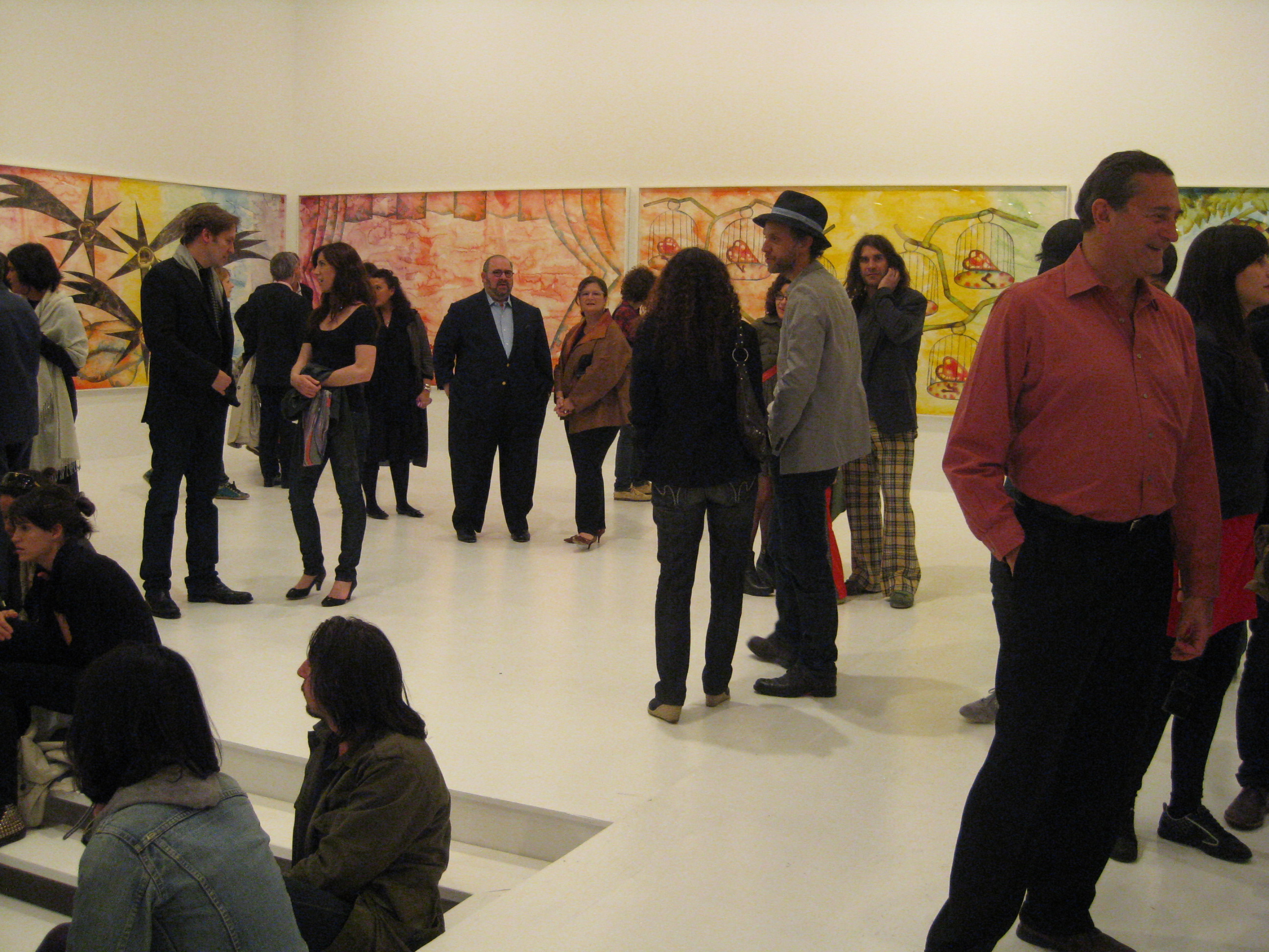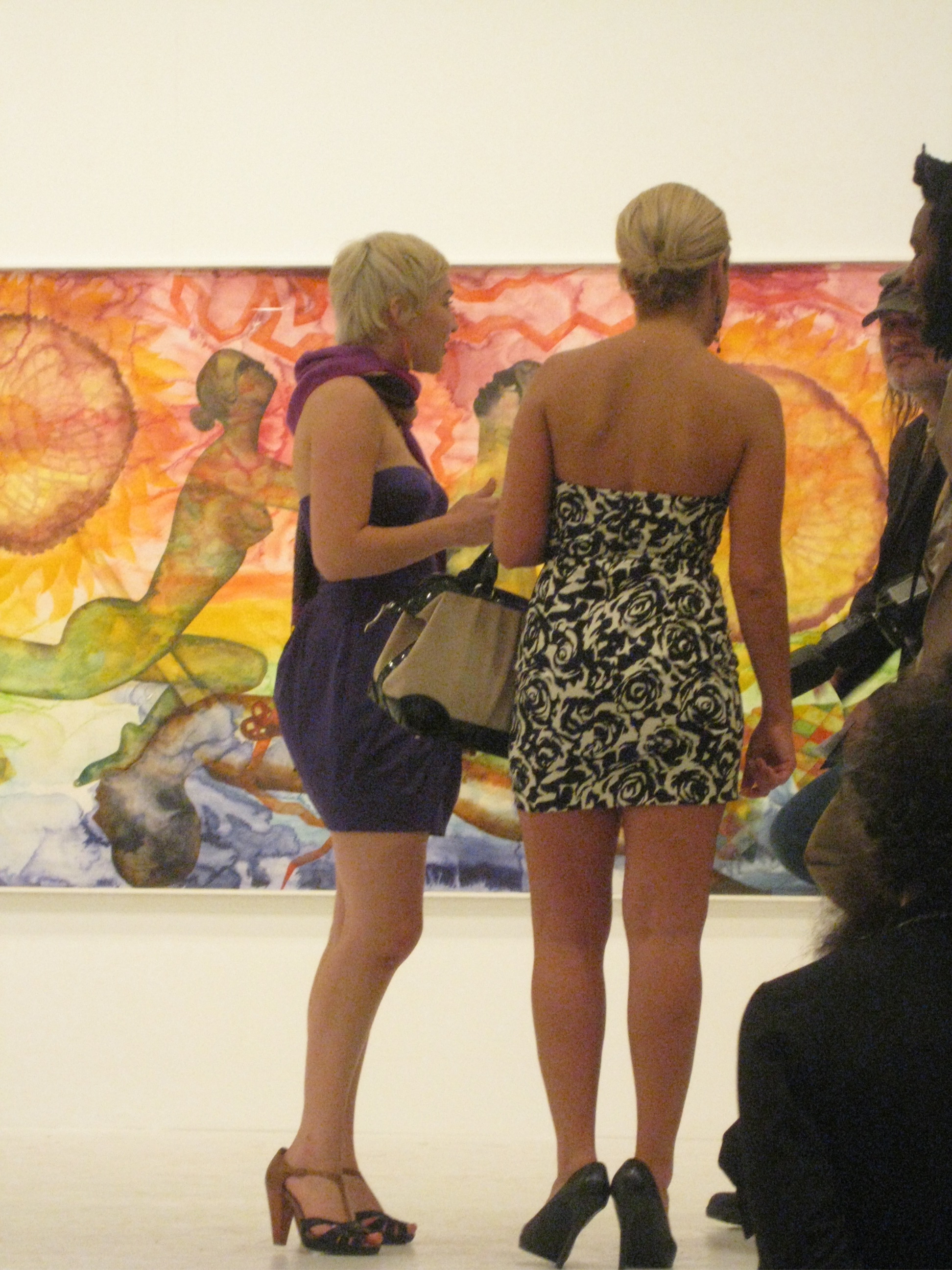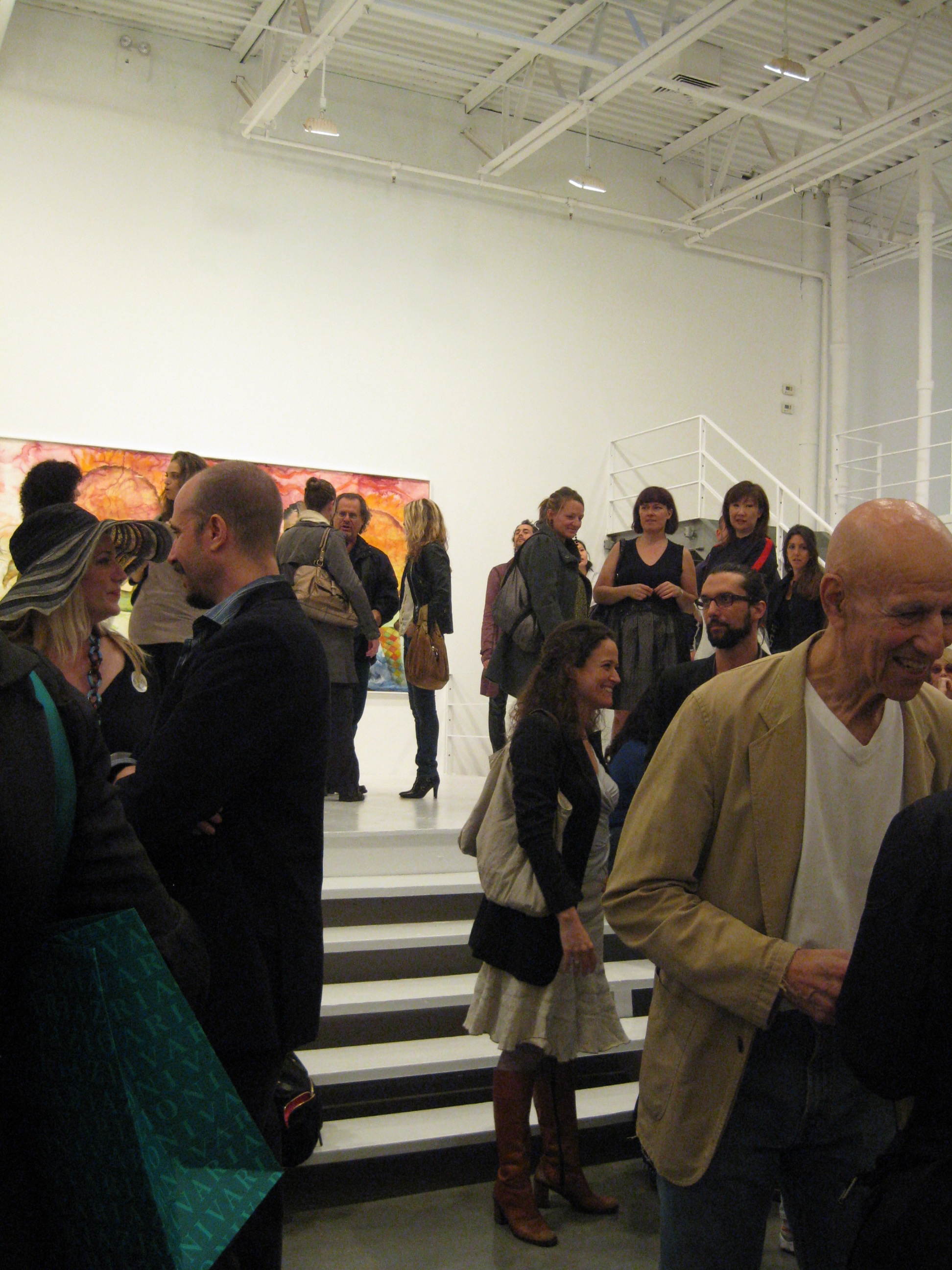 Last night, Francesco Clemente’s latest show at Deitch Projects opened with a star-studded evening in SoHo. The exhibition consists of large-scale watercolor paintings that are positioned in a continuous line along the gallery walls. This particular hanging corresponds to Clemente’s aim to embed art with a spiritual experience. The idea of a rainbow closely reflects the works in the show. For Clemente, a rainbow is a symbolic structure that sets up connections between people and worlds, and using watercolor allows the light of the paper to come through. Moreover, the watercolors are bright and come after a long period in which the artist worked with a darker palette. In order to arrive at the final form of the works, Clemente started out with three large scale canvases that were each 60 foot (about 18 meters) long. He then divided each of them by cutting them into five separate sections. When hung next to each other, the rainbows reconnect in the mind of the viewer. The iconography in the work is derived from candomblé from the Americas, alchemy from Europe and tantra from India. The exhibition will run through May 30, 2009. Among the crowd were Goldie Hawn and daughter Kate Hudson who were enjoying the show with artist Dustin Yellin who was is now showing at Robert Miller Gallery and who was interviewed by AO recently here.