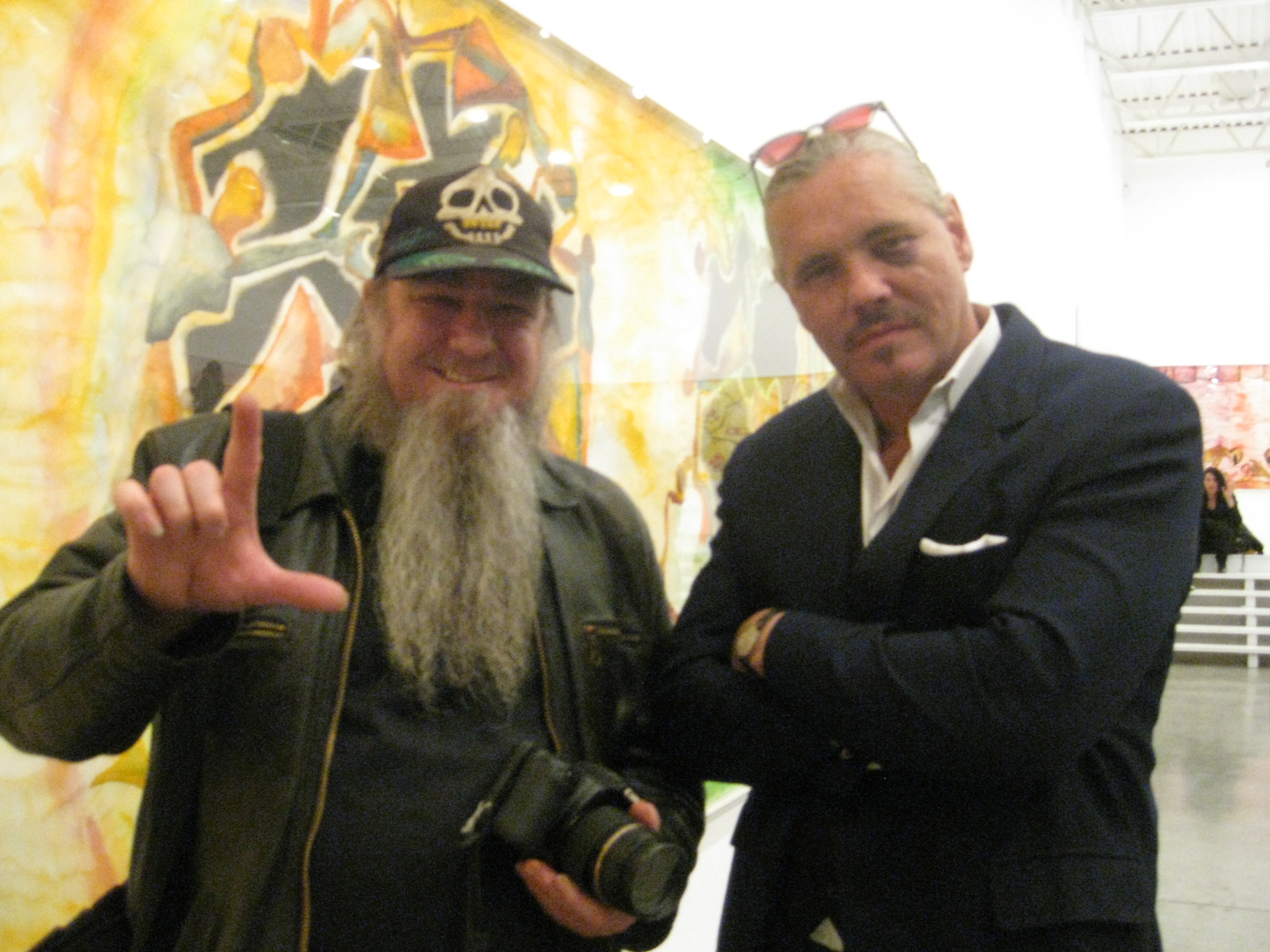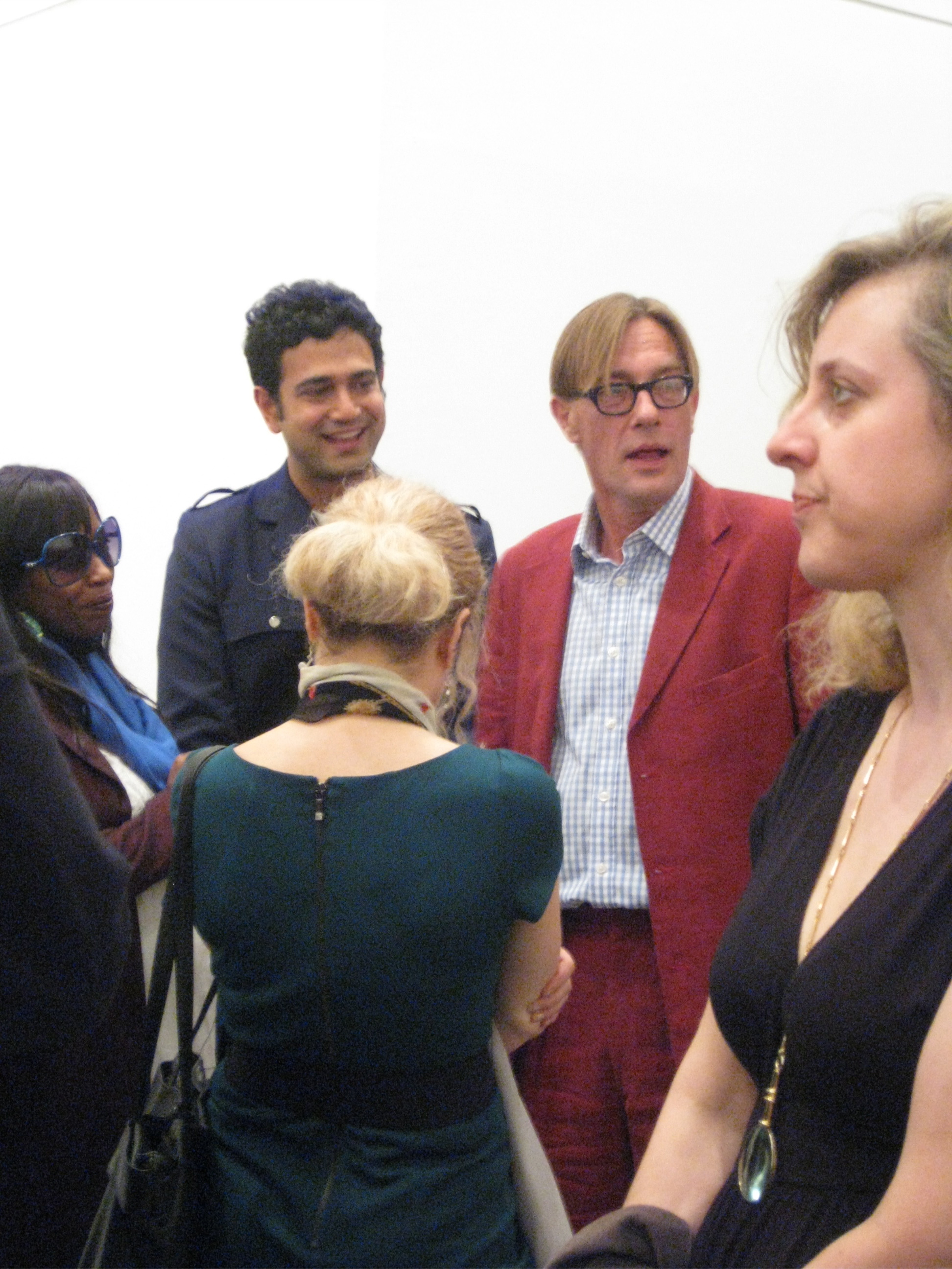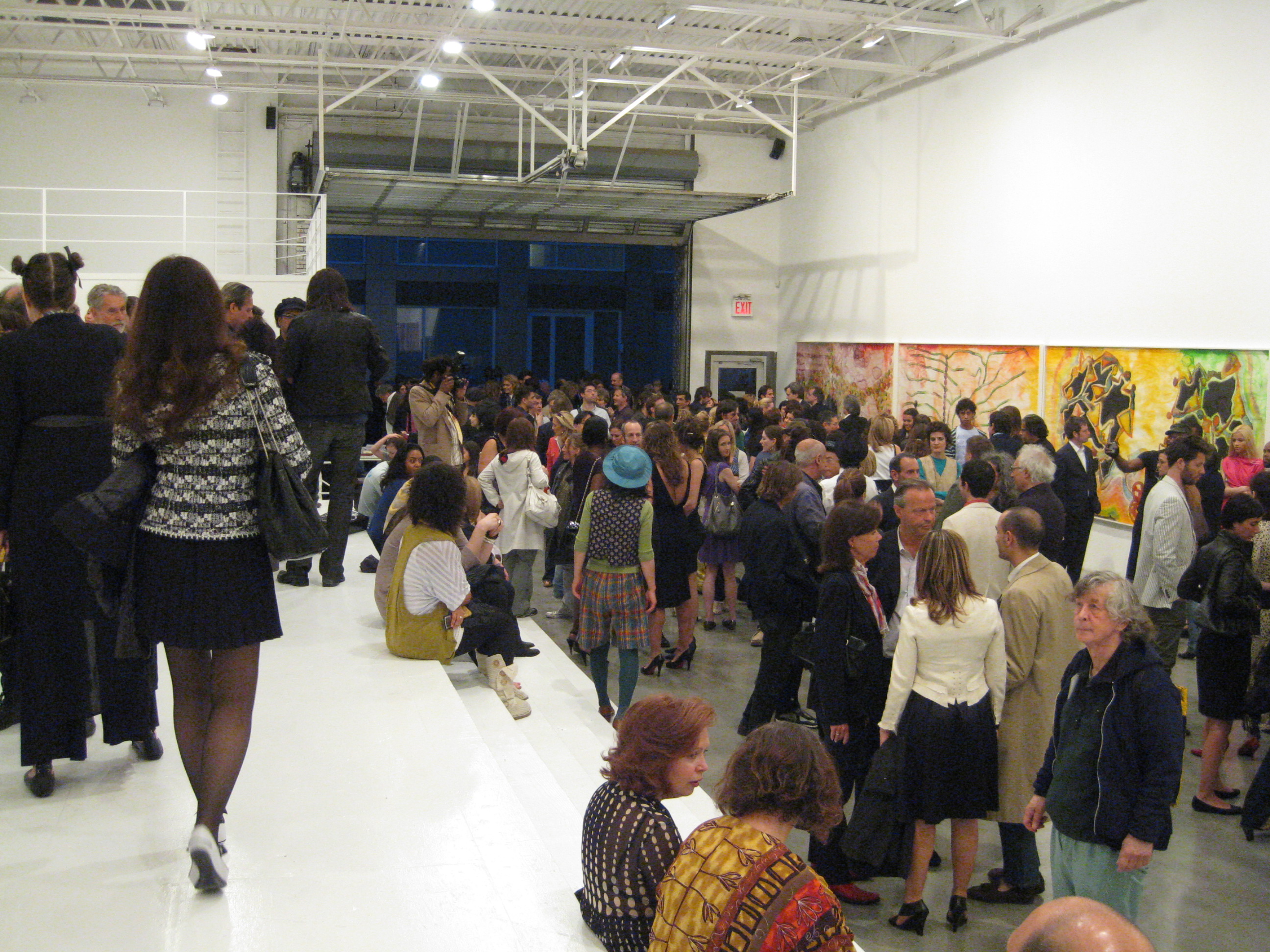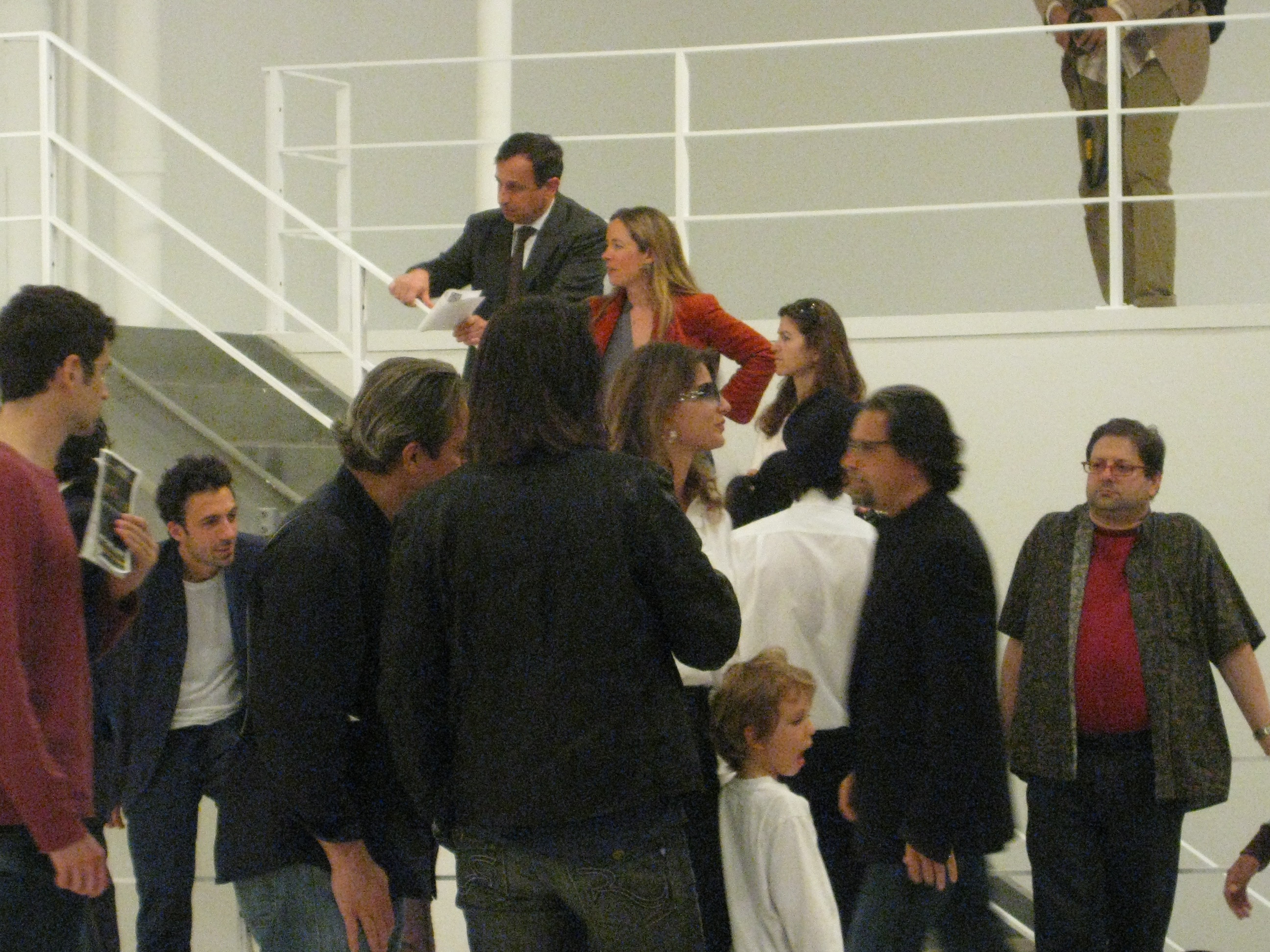 Last night, Francesco Clemente’s latest show at Deitch Projects opened with a star-studded evening in SoHo. The exhibition consists of large-scale watercolor paintings that are positioned in a continuous line along the gallery walls. This particular hanging corresponds to Clemente’s aim to embed art with a spiritual experience. The idea of a rainbow closely reflects the works in the show. For Clemente, a rainbow is a symbolic structure that sets up connections between people and worlds, and using watercolor allows the light of the paper to come through. Moreover, the watercolors are bright and come after a long period in which the artist worked with a darker palette. In order to arrive at the final form of the works, Clemente started out with three large scale canvases that were each 60 foot (about 18 meters) long. He then divided each of them by cutting them into five separate sections. When hung next to each other, the rainbows reconnect in the mind of the viewer. The iconography in the work is derived from candomblé from the Americas, alchemy from Europe and tantra from India. The exhibition will run through May 30, 2009. Among the crowd were Goldie Hawn and daughter Kate Hudson who were enjoying the show with artist Dustin Yellin who was is now showing at Robert Miller Gallery and who was interviewed by AO recently here.