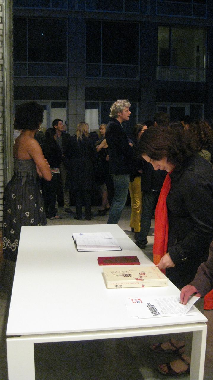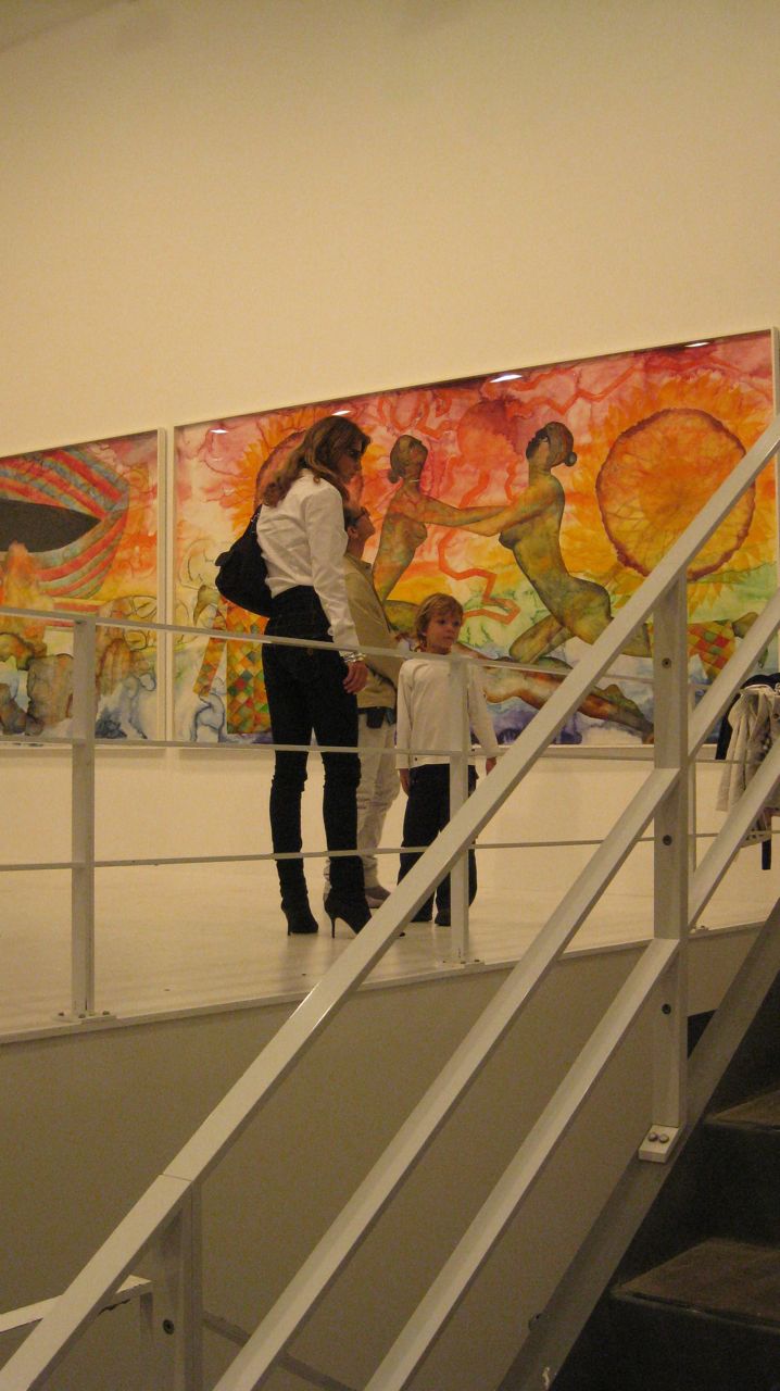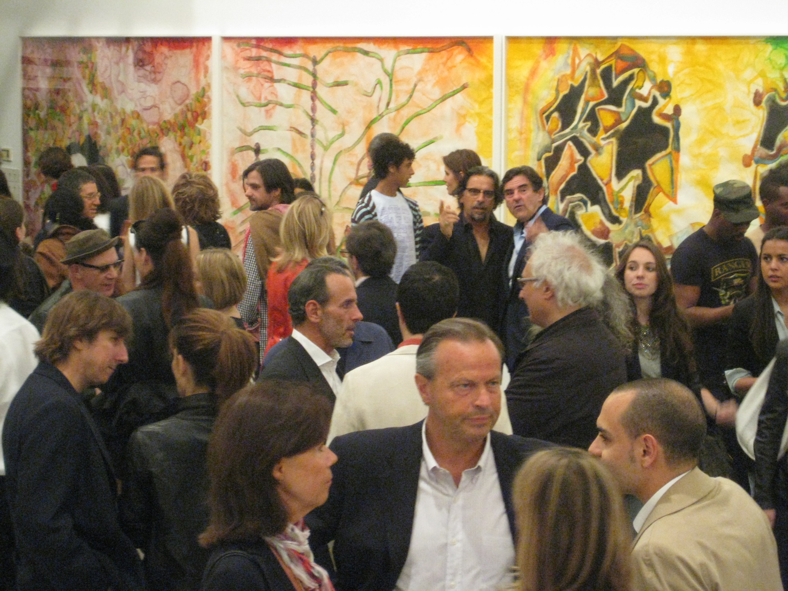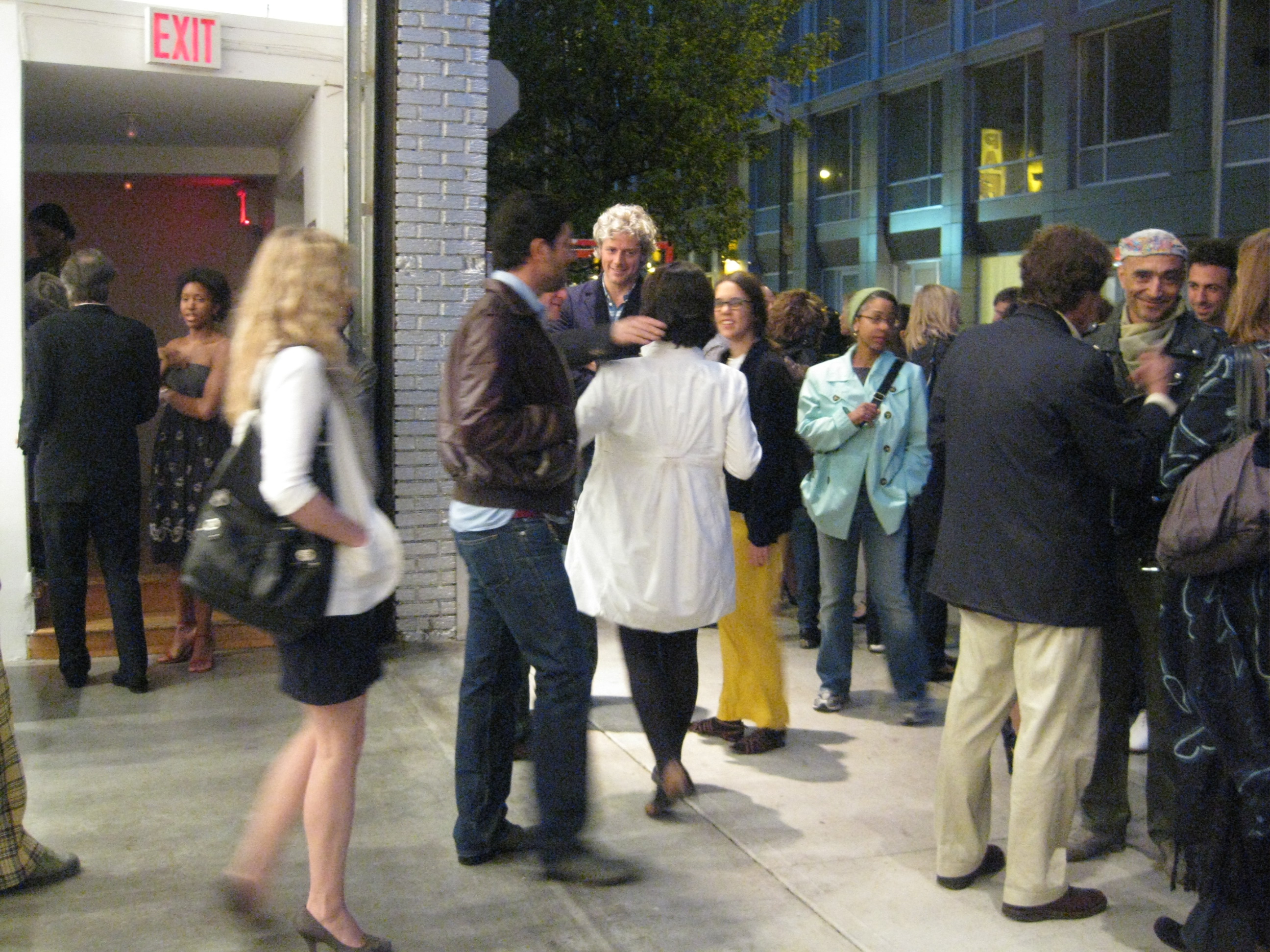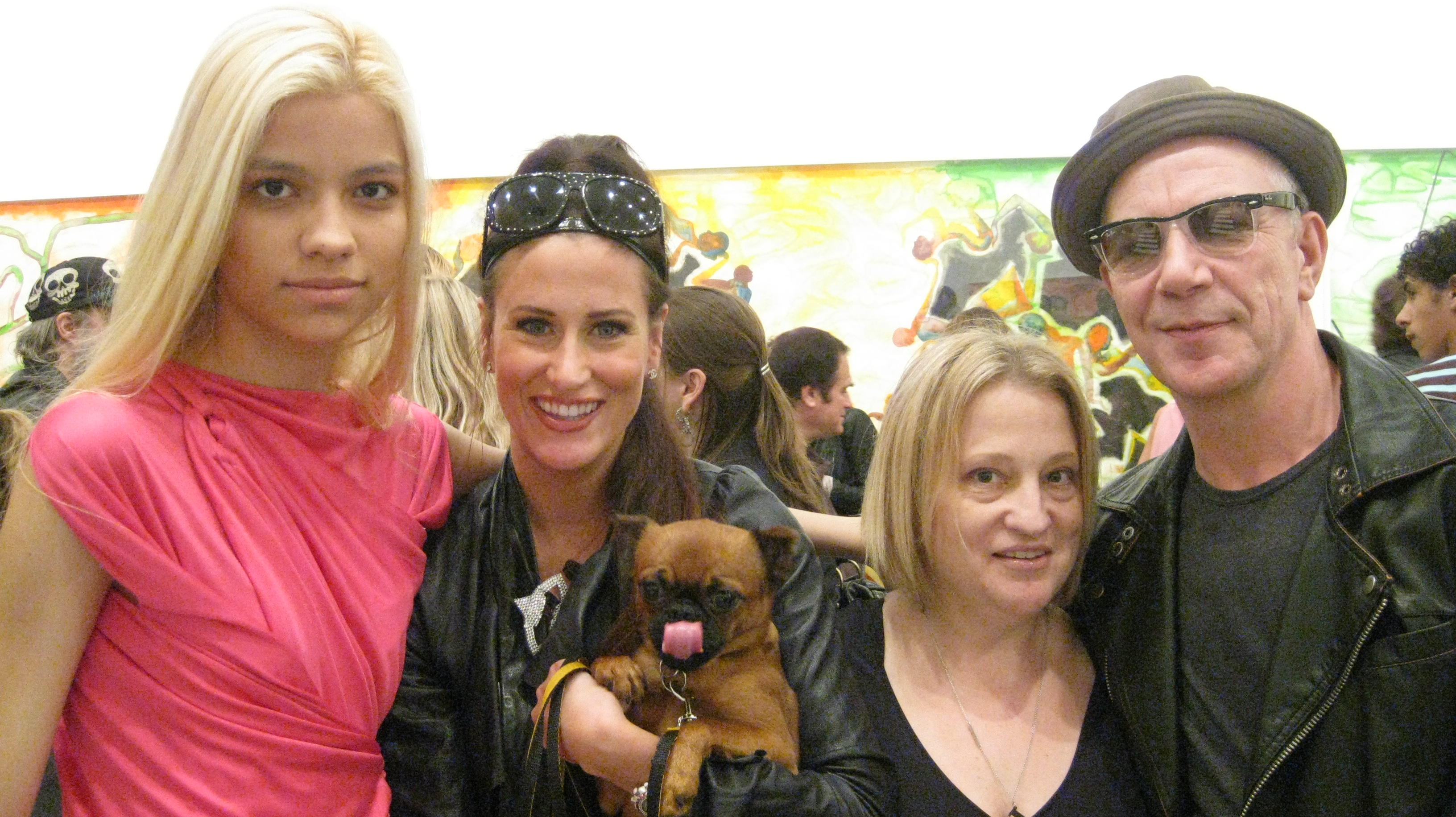 Last night, Francesco Clemente’s latest show at Deitch Projects opened with a star-studded evening in SoHo. The exhibition consists of large-scale watercolor paintings that are positioned in a continuous line along the gallery walls. This particular hanging corresponds to Clemente’s aim to embed art with a spiritual experience. The idea of a rainbow closely reflects the works in the show. For Clemente, a rainbow is a symbolic structure that sets up connections between people and worlds, and using watercolor allows the light of the paper to come through. Moreover, the watercolors are bright and come after a long period in which the artist worked with a darker palette. In order to arrive at the final form of the works, Clemente started out with three large scale canvases that were each 60 foot (about 18 meters) long. He then divided each of them by cutting them into five separate sections. When hung next to each other, the rainbows reconnect in the mind of the viewer. The iconography in the work is derived from candomblé from the Americas, alchemy from Europe and tantra from India. The exhibition will run through May 30, 2009. Among the crowd were Goldie Hawn and daughter Kate Hudson who were enjoying the show with artist Dustin Yellin who was is now showing at Robert Miller Gallery and who was interviewed by AO recently here.