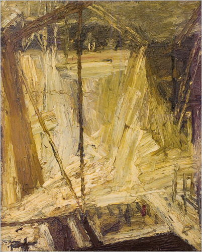 Frank Auerbach, “Shell Building Site from the Thames.” 1959, Via NYTimes In this piece, a collapsing crane sends a cable plummeting into an excavation site.