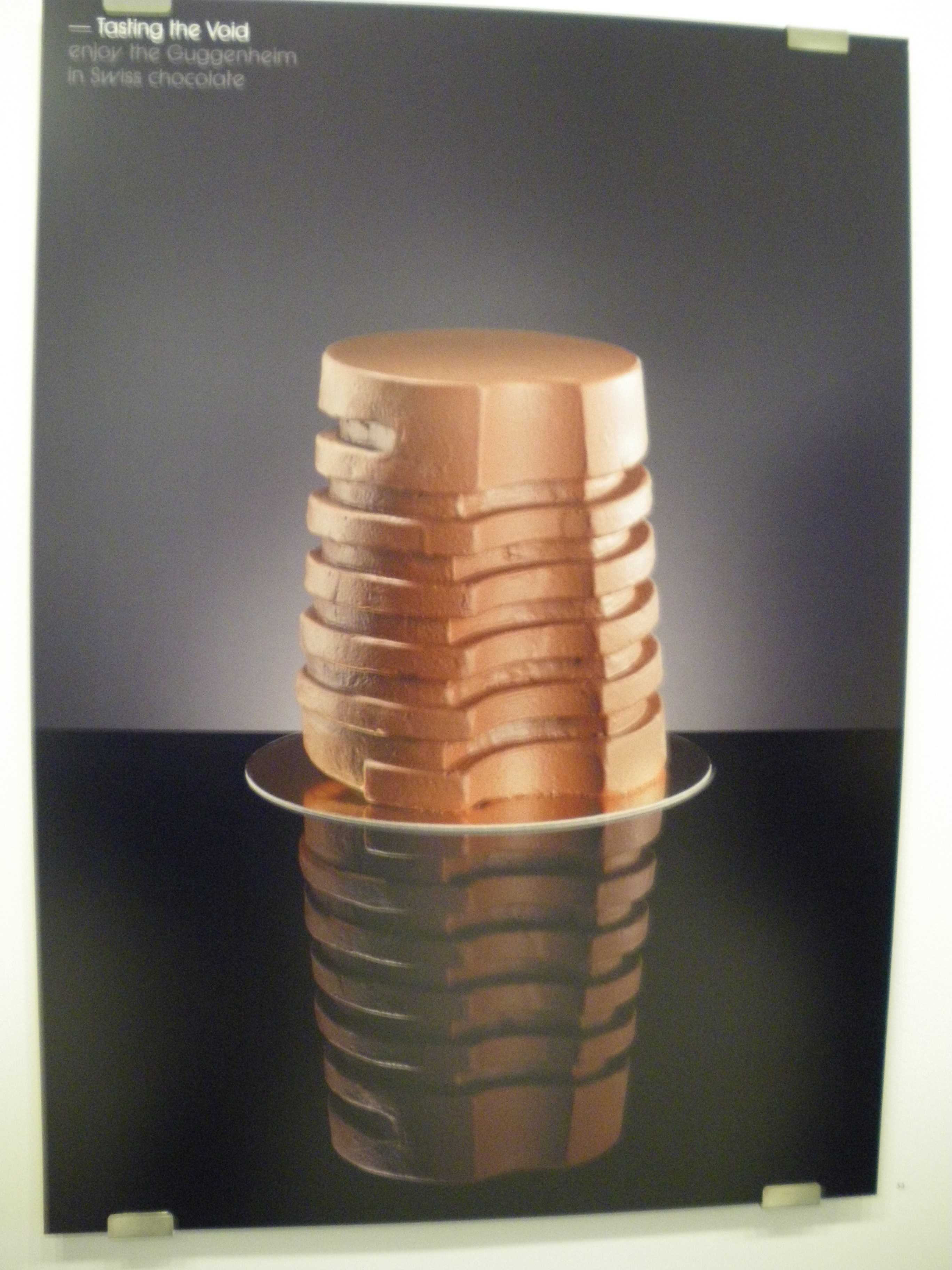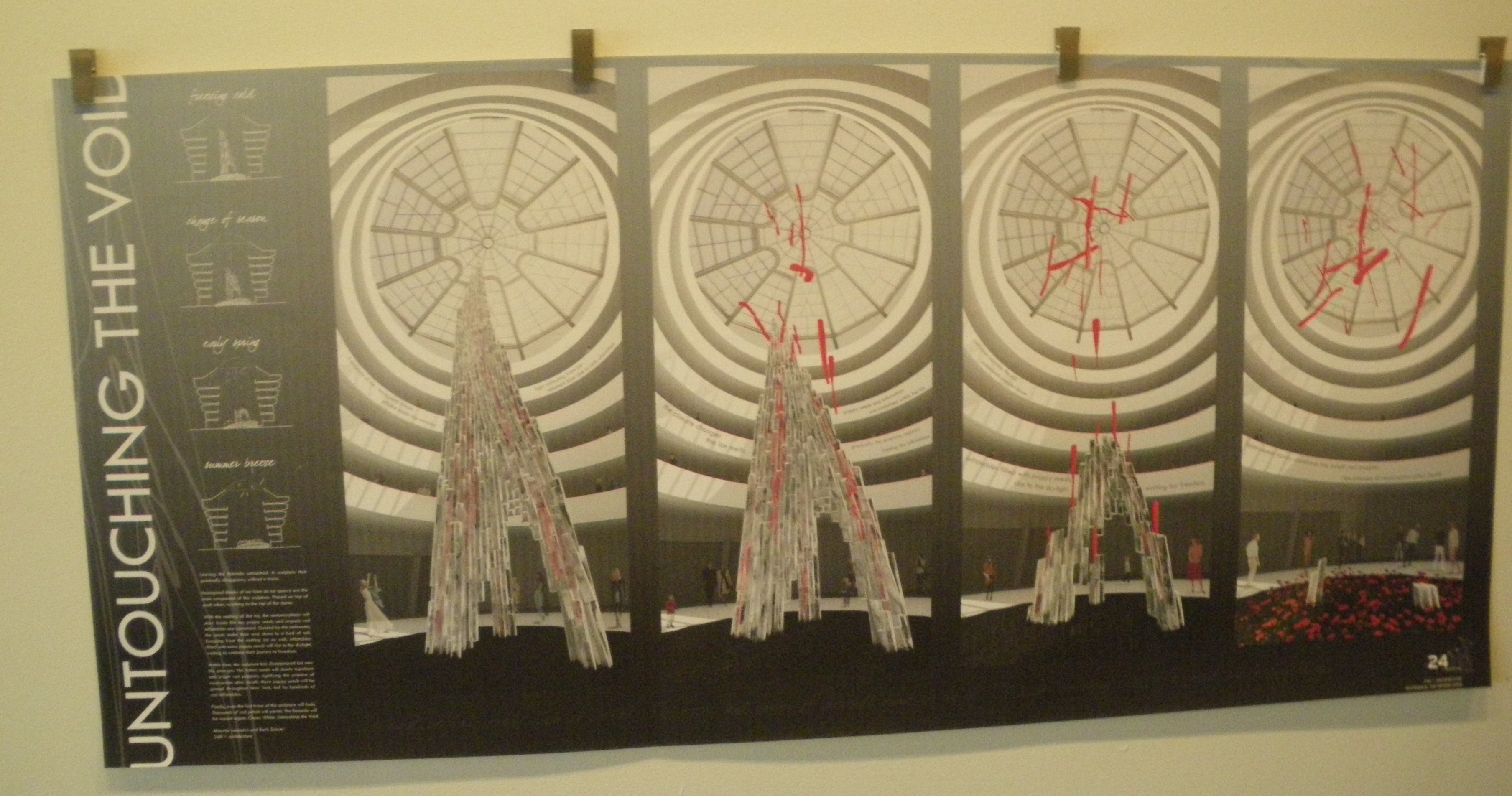 Obstructing the void calls for its subversion. In drawing the void, the architect duo Weiss/Manfredi trespass it. group8 works against the institution that it proposes to fill, so that patrons would actually be able to taste the void — interacting with it physically — and so that the artists would leave the Guggenheim with a structure of chocolate at its core, implying an idea of whimsy that battles the hierarchical nature of “serious” art. The void is reflected, and turned to banners: in Thomas Hirschhorn’s proposal, the void becomes a place to examine the artist’s function, and the institution’s, in structuring an art that supposes to liberate.