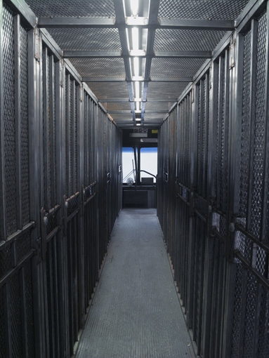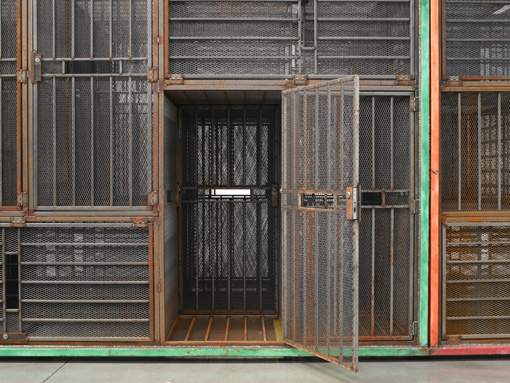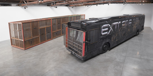 Where “Pig Pen” is a stationary cage, “Bus” is a vehicle of transportation converted into a sculptural object, emphasizing 2Traps’s feel of ultimate stasis. They are the same size — about 10′ x 9′ x 40′ — but “Pig Pen” is almost cubist nature, comprised of smaller blocks themselves composed of the security doors found on many urban homes, where “Bus” is just that automobile fitted with speakers, sub-woofers, chrome, and confinement cages. That is, the artist in both cases confines an animalistic interior, but “Bus” comments most explicitly on societal stagnancy. Argues Ruby, today’s transportation holds its patrons still, defines them as animals in a procedurally ordered, dehumanized/dehumanizing society.