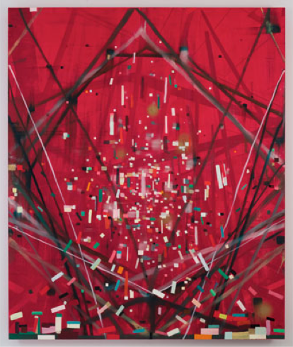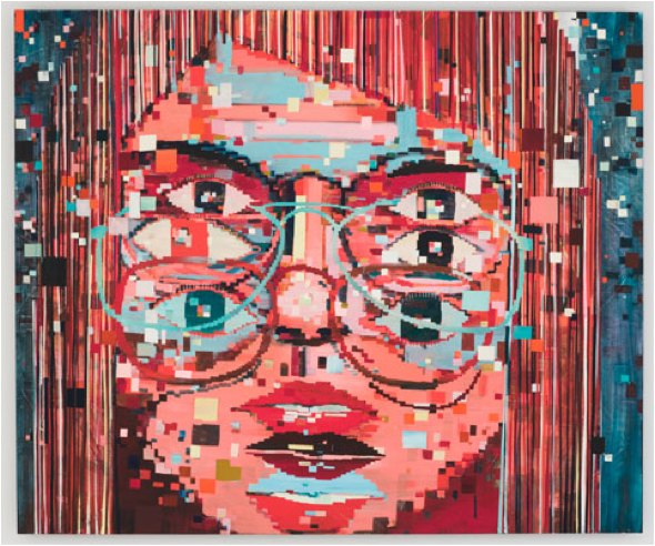 In addition, there are three wizards, gods, or spirits that watch over Premonition. First, Hawkes and Doves (2010 48” x 56”), whose haunting gaze stares out from behind a pixilated bushy beard and brow, forming the wings and tail of a soaring bird. Second, Eyes of a Fortune Teller (2010, 80” x 96”) whose bespectacled eyes are multiplied and digitally distorted as if by cosmic interference, surveys the room. Last and more subtle, Speculator (2010, 65” x 96”) stands looking out from beneath a broken red halo amidst colored streamers with open arms carrying a scepter in one hand and blessing us with the other.