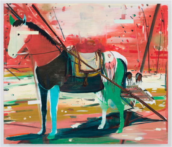 We are also presented more ominous images. For example, Dismounted (2010, 40” x 46”), where the painted out ghost of a mounted horseman sits atop his piñata-like steed standing to attention, still attached to a sled that may have been used to carry wounded or dead from the field. This is actually one of the strongest pieces in the show as the colors, composition, and painterly execution all come together harmoniously.