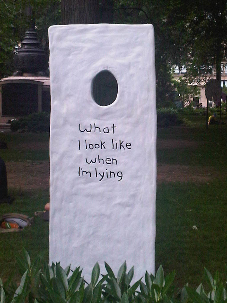 This weekend marks the opening of author, artist, and filmmaker Miranda July‘s sculpture installation of Elven Heavy Things in Union Square Park, New York. Originally shown at the Venice Biennale in 2009, the work consists of eleven fiber-glass and steel lined pieces that invite viewer participation to complete the piece–to stand on pedestals inscribed with phrases like What I Look Like When I’m Lying, The Guiltiest One, and We Don’t Know Each Other We’re Just Hugging for the Picture…, place limbs through holes in the sculptures, and stand beneath headdresses. These actions transform the works from still sculptures into interactive, performance based works. July encourages visitors to photograph themselves posing with the sculptures, and to then upload them to websites, sharing them with friends. July explains that once the photographs are shared, “the audience changes, and the subject clearly becomes the participants, revealing themselves through the work.”