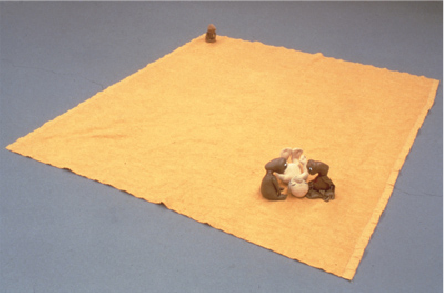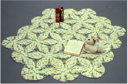 By displaying these playthings antiseptically and discretely from actual usage, Kelley transforms these gifts from toys to museum objects. However, by creating floor-bound, childlike arenas, he challenges the quintessential immaculateness of a gallery. At once, he calls into question both the emotionality of toys and gifts and the concept of stainless museum pieces.