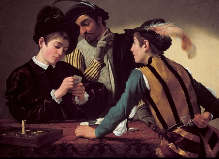 One of Caravaggio’s most notable contributions to later artists was his monumental treatment of the genre scene. I bari (Card Sharps), on loan from the Kimbell Art Museum in Fort Worth, Texas, exemplifies Caravaggio’s penchant for depicting everyday low-life scenes on a large scale. This work in particular represents a significant moment in Caravaggio’s career as it marked his debut on the art market around 1594 as an independent artist free of workshop affiliation.