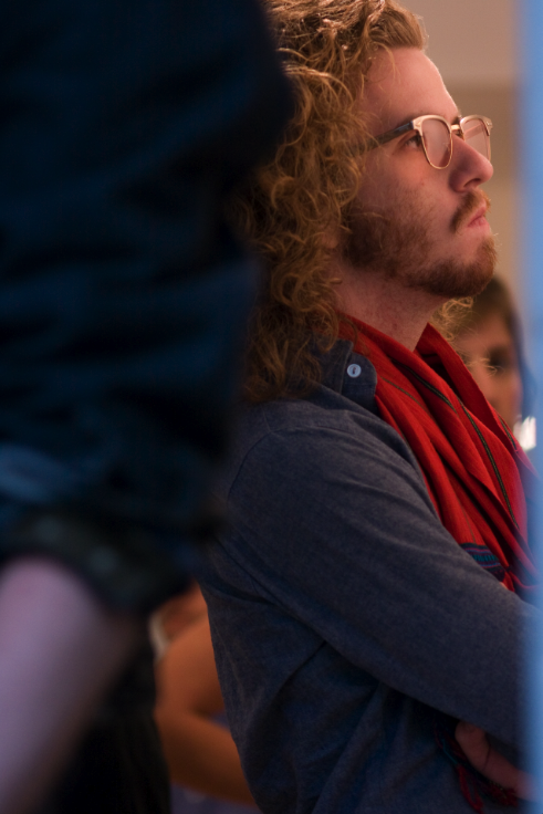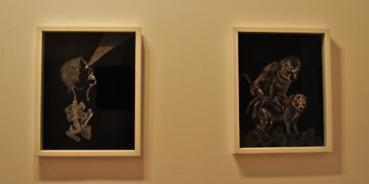 Adam Tullie, business partner of featured artist Angeline Rivas, exhibits pencil and gouache pieces.  He tells AO that he is inspired by “simple shapes, and anything bizarre,” and by favorite artists Amedeo Modigliani, Pablo Picasso, Peter Doig, Chris Ofili, and Mark Rothko. He cites his fine art as the basis for his and Rivas’ label, Cavern Collection: “The whole foundation [of the label] is derived from this, our actual work.  We use hand-drawn patterns and imagery on our clothing.”
