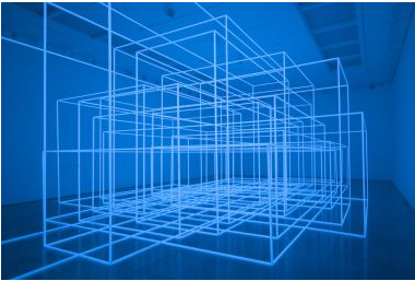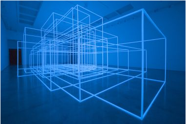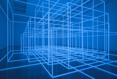 Gormley exhibits Breathing Room III (2010) in the lower gallery room, the third in this series of works which involve the viewer’s involvement in a shifting ground. The work is made from 15 inter-connecting photo-luminescent space frames; the total volume is equivalent to that of the internal gallery space. The installation encourages the viewer to participate with the work where time and light are the principle elements. Instead of engaging with a defined sculptural space the individual must pace themselves amidst intense bursts of light and total darkness.