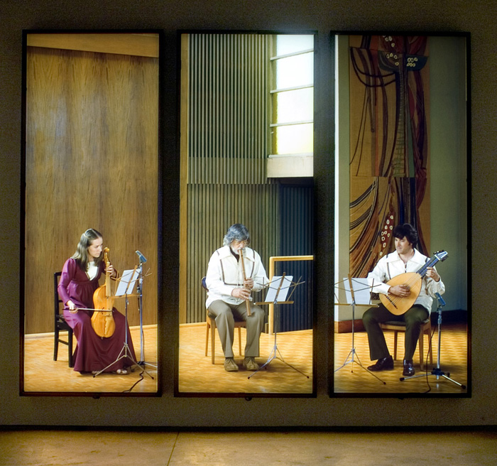 Rodney Graham’s “3 Musicians (Members of the Early Music Group ‘Renaissance Fare’ performing Matteo of Perugia’s ‘le Greygnour Bien’ at the Unitarian Church of Vancouver, Late September, 1977)” (2006) © 303 Gallery.