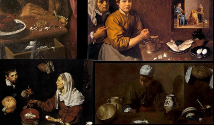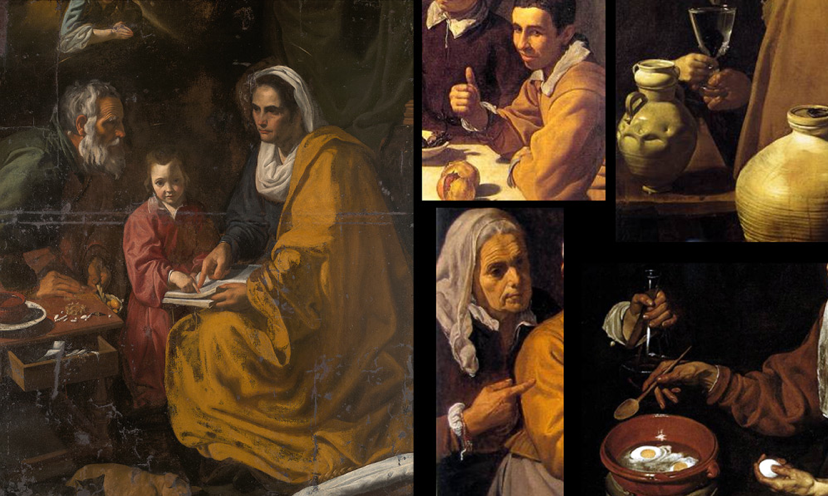 Daily life, as seen by Velázquez in four of his works. Top right is a detail of The Education of the Virgin with Christ in the house of Martha and Mary. At the bottom right are Old Woman Cooking Eggs and La Mulata. Image courtesy El Pais.