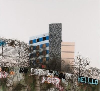 Salon 94 Freeman’s also offers rich rewards in “Chapter Seven: Wolf Tickets.” Like Frazier’s self-portrait, Patrick Lee’s portrait, Deadly Friends (Big Top) (2010), depicts a person or a character that would be at home in the streets. The image of Big Top simultaneously attracts viewers to him and even through the mediating graphite and paper, puts them on their guard. Part of Big Top’s appeal is his hyper-intelligent wariness; he would not be so easily caught by the novel’s Quality of Life squad. Erik Benson’s Overgrowth (2010), is an excellent example of his unique painting style and could easily serve as a stage for the unfolding events in Lush Life. His images are finely detailed renderings of urban ruin and waste which each feature a specific element that subtly rises off the surface of the canvas through the buildup of millimeter thick layers of paint.