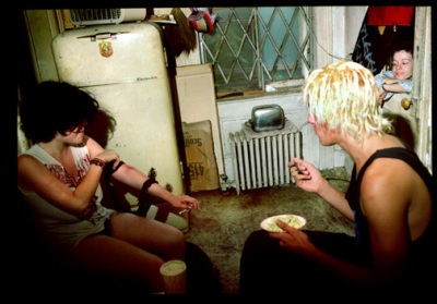 The exhibition at Collette Blanchard, “Chapter Six: The Devil You Know,” comprises mostly photographs. Angry eyes glower out at us from LaToya Ruby Frazier’s Self-Portrait (2010). The artist’s sex is indeterminate in the image and the mysterious figure’s placement in such an odd setting—a quirky but certainly outmoded and messy bathroom— combine with the blazing intensity of her body language makes to create a compelling image. There is no direct relationship to the book in this photograph, but the artist, at least as attired and posed in Self-Portrait, could easily fit in with the wolves that run through the LES.