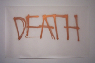 Lehmann Maupin’s exhibition, “Chapter Four: Let it Die,” yielded the best pickings. The most affecting works in the exhibition correspond directly to the pulsing dread and madness that envelop the character of Billy Marcus, who obsessively wanders the LES alternately looking for his dead son and his son’s killers. Rashid Johnson’s large, framed mirror spray-painted with the word “DEATH” is both a crass declaration and a more subtle suggestion of a momento mori. Nina Lola Bachhuber’s series of 16 pen and ink drawings of capering, skeleton-headed creatures, Untitled (2009), also recalls Medieval momento mori. However, Bachhuber’s creatures often cavort too sweetly to serve as a sobering reminder of our mortality. Amy Logenecker-Brown’s small canvases (10 x 8 inches), Bedroom (2009) and Bathroom (2009), yield maximum horror per square inch: a figure seeming to spontaneously combust in a dingy apartment, an ominous white cloud erupting from a battered toilet stall. The woozy fright of Bedroom is intensified by the work hung to its right, Dani Leventhal’s deer-blood painting, Untitled (2008), which looks like nothing so much as huge scorch mark.