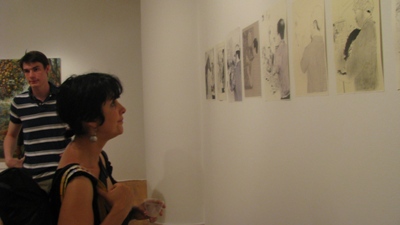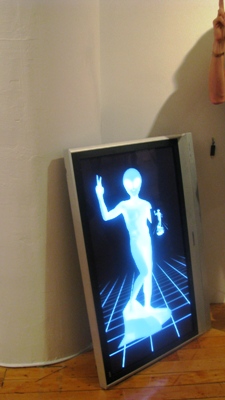 James Shaeffer’s choices focus on contemporary art’s place in the world of technology, and more specifically, the increasing ability to destroy original work through file sharing and the like. His pieces were especially noticeable in the exhibit. Monitors featuring glowing aliens were placed around the gallery. These acted as “foreigners,” or foreign technologies, that were weeding into the more material and human world.