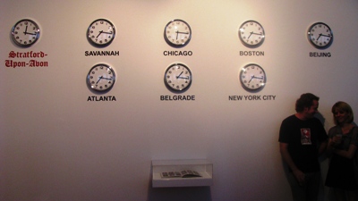 Erin Dziedic, a curator at the exhibitor, focuses on the “successes” and comparative “failures” of the contemporary art world as they relate to those in William Shakespeare’s time. One of his pieces, Chorus (2008-2009) by Craig Dennen, is a row of clocks that display the local time at eight different locations: Stratford-upon-Avon, Beijing, Chicago, Boston, Savannah, Atlanta, Belgrade, and New York City. Through these clocks, Dziedic draws a connection from Shakespeare’s world to ours. In the past, Dennen has focused on Shakespeare’s play Timon of Athens, considered to be a failed piece. Dziedic and Dennen attempt to draw a connection between this failure and more recent ones. The clocks show that while Shakespeare is dead, his birthplace still exists, and time still passes there.
