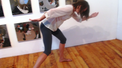 Hired dancer at exhibit next to piece chosen by curator James Shaeffer