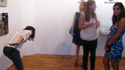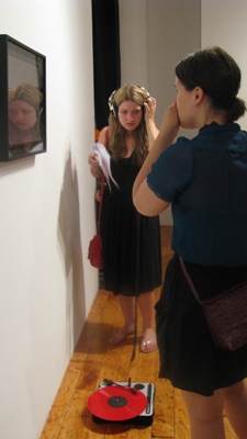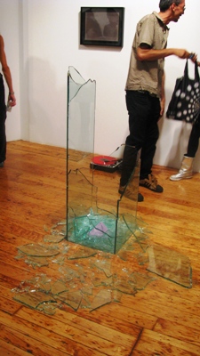AO was able to speak with the curators, who explained the reasoning behind their choices of the works of art. Andrew Russeth worked with Liza Buzytsky, who both curated the exhibit and whose work was included. Their exhibition was titled Personal / Public / Private, and had an almost “more than meets the eye” theme. I’ll Stab you in the Back (2009), by artist Alexandra Spaulding, is a sound piece that “is [both] monotal but really textured sound,” according to Russeth. In this sense, it appears to be a “public” display that eventually becomes intimate and private. Though the music seems dense, it is actually more complicated – a“private language that’s being expressed.” Buzytsky had work shown in the same exhibit. Hers was titled I Don’t Live Here Anymore (2010) and she became inspired to create the piece during her day job at an art shipping company. She has taken a mirror and broken it so that the individual pieces rise cut and shattered. As Russeth explained, a mirror is a “minimalist structure” that becomes more personal when it is broken.