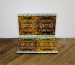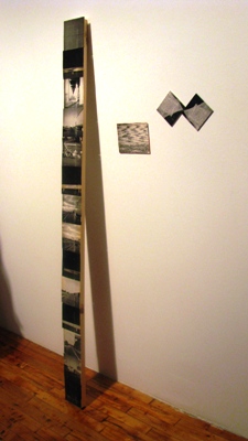 Bryan Graf is an artist at the exhibit whose work is based on his personal life and his home in New Jersey. As he remarked to AO, the viewer never gets to see who’s taking the picture. That’s why some of his photographs feature him as the subject, holding up a photogram that is in the process of developing. In this sense, it is a shot/reverse shot. Graf is from New Jersey, and he commented on the duplicity of the state: “It’s called the Garden State, but in a sense it’s a joke.” Power plants are juxtaposed with expanses of green. Graf, however, does not try to only focus on the “good” parts of the state: his family garden or his rural surroundings. One of his pieces is titled Taboo Totem (Interstate) (2010), and its shape is true to its name: it is a long, rectangular strip of cardboard that lay against the wall of the gallery. It featured pictures taken on the New Jersey interstate, “one of the most heavily traveled areas in the country.” In one photo, a bird rises from the cement, struggling to escape the cars and fumes; in another, green grass lies trapped under cement columns. In this sense, Graf is very objective, giving equal attention to both nature and man-made material.