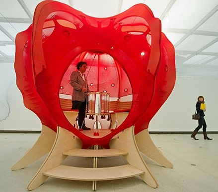 The next installation in the show, titled Circleproteitemple, represents the heart. Neto has constructed a large red pod that viewers are invited to go inside. The interior is equipped with a drum set for guests to play while the pod pulses to its on distinct beat.