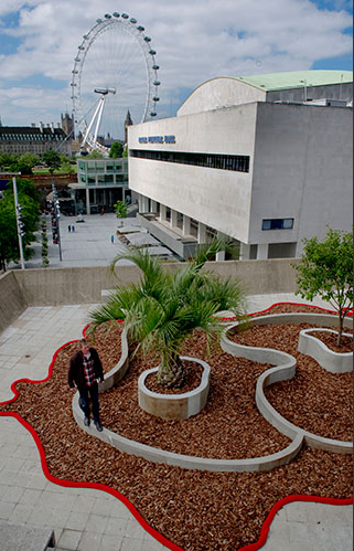Neto transforms the Hayward’s three outdoor terraces into public parks making a grand statement for his first outdoor installations. The first terrace is a garden pathway. The path is in the shape of an infinity symbol, raised from the ground, and enclosed in a red nylon box. Two trees neatly line the path adding greenery to their concrete surroundings. One is a palm tree, indigenous to Brazil, Neto’s homeland, and the other a hawthorn, indigenous to the United Kingdom, the home of the exhibition. The high-wire artist Philippe Petit inspired this installation.