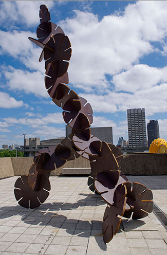 The third terrace was designed as a sculpture park. This instillation displays a relatively new direction in Neto’s work. He has recently begun experimenting with Corten steel to create large-scale sculptures. This sculpture, which is displayed in “The Edges of the World” for the first time in London, is inspired by a 1960’s children’s toy. While visitors explore the terraces; they animate the artwork through their participation whether they are submerged in a sculptural pool or balancing on an undulating path.