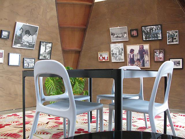 The wallpaper consists of photographs of local Korean-Americans framed by floral cut-outs. The medium refers to a previous Pardo work, in which a wallpaper installation was used to trace the social history of Los Angeles. Here the wallpaper figures into a larger installation which is presented as a Drawing Room.