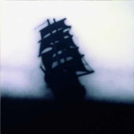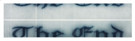 In 1986, Ruscha began a series of wordless, “strokeless” silhouette paintings. Although traditionally the artist only used oil paint on canvas, for this series he “wanted something smoky and difficult to see.” Against his own principles, Ruscha used a spray gun and acrylic paint to achieve the blurred effect. A blanked-out word or image, he felt, “can suggest to you something like a censor’s strip. Or it can suggest the opposite. It can suggest a space for thought…” But always a formalist, it is the “bang of the black and white together” that most interested him.