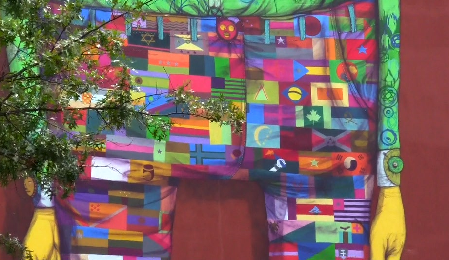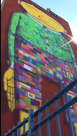 An important purpose of the mural is to promote a message of international unity. From Chelsea, the duo shares their trademark yellow character, “Gigante” with all of New York, as they have done in Greece, Holland, Lisbon, London and San Paulo. In this mural, “Gigante” wears shorts that feature colorful flags from countries around the world. The flags are painted in non-traditional colors to suggest the idea of “Unity, a world without borders, combined to form ‘one world one voice,’ without distinction to language or race…” [Os Gêmeos]