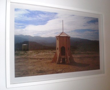 Two small wooden houses and a rocket ship fill the last and largest room. According to the gallery’s press release, each is “a recreation of houses featured in [Franco’s] short film.” The rocket ship is held up by triangular supports and balances a tall, thin spike on top. Nearby pictures feature the rocket ship in other locations: on a valley in an exotic land, for example, adjacent one of the other miniature structures.